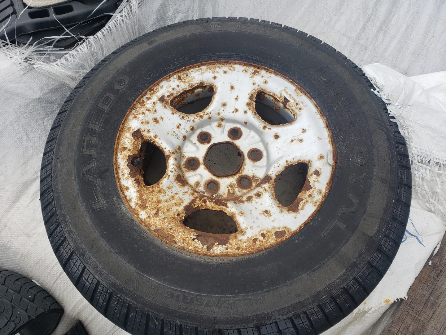10GM Rim & new Tire , 6 bolt ( Pickup, Van , SUV etc ! ). Size 235/75R16. Uniroyal Laredo brand. rim has surface rust but fully balanced and ready to install ! or good for Spare $95.00.