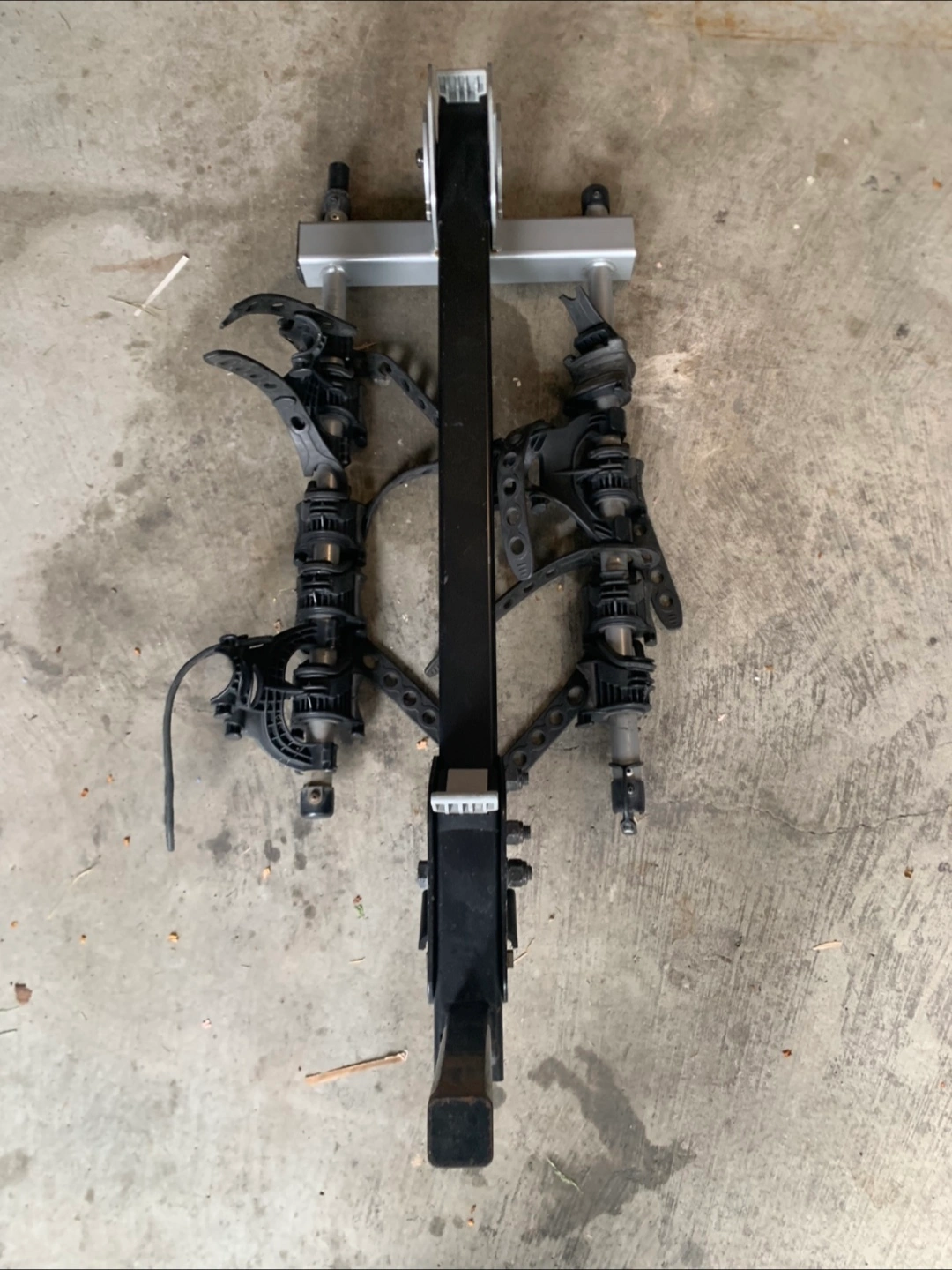 Thule Hitch mount bike rack. Holds four bikes. Grey and black. Only one strap works but parts can be purchased from any Rack supplier. Comes with lock and key - both are functional!