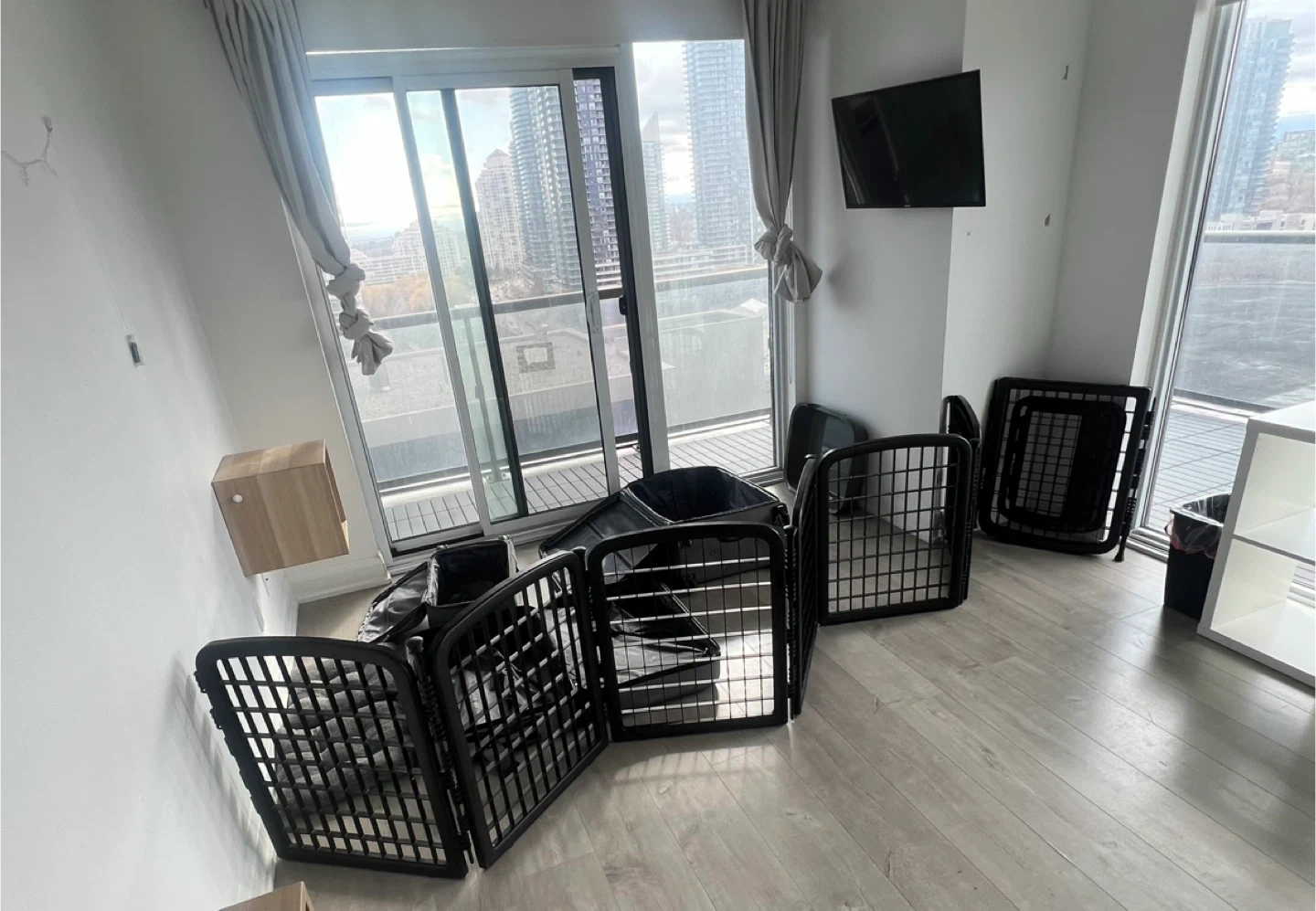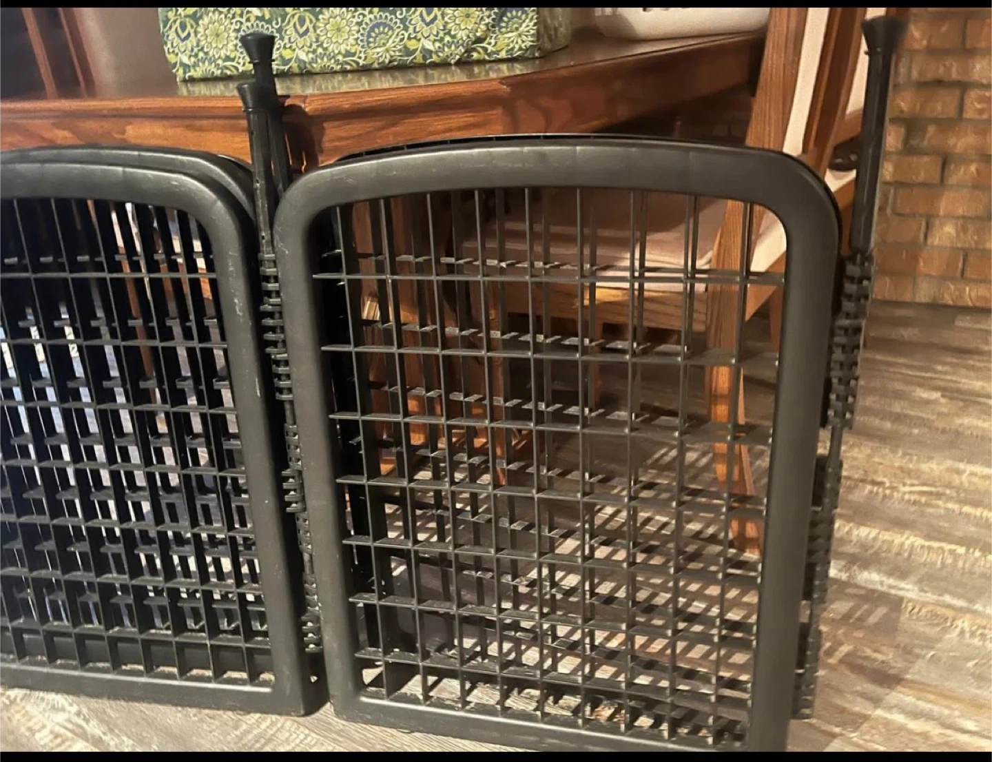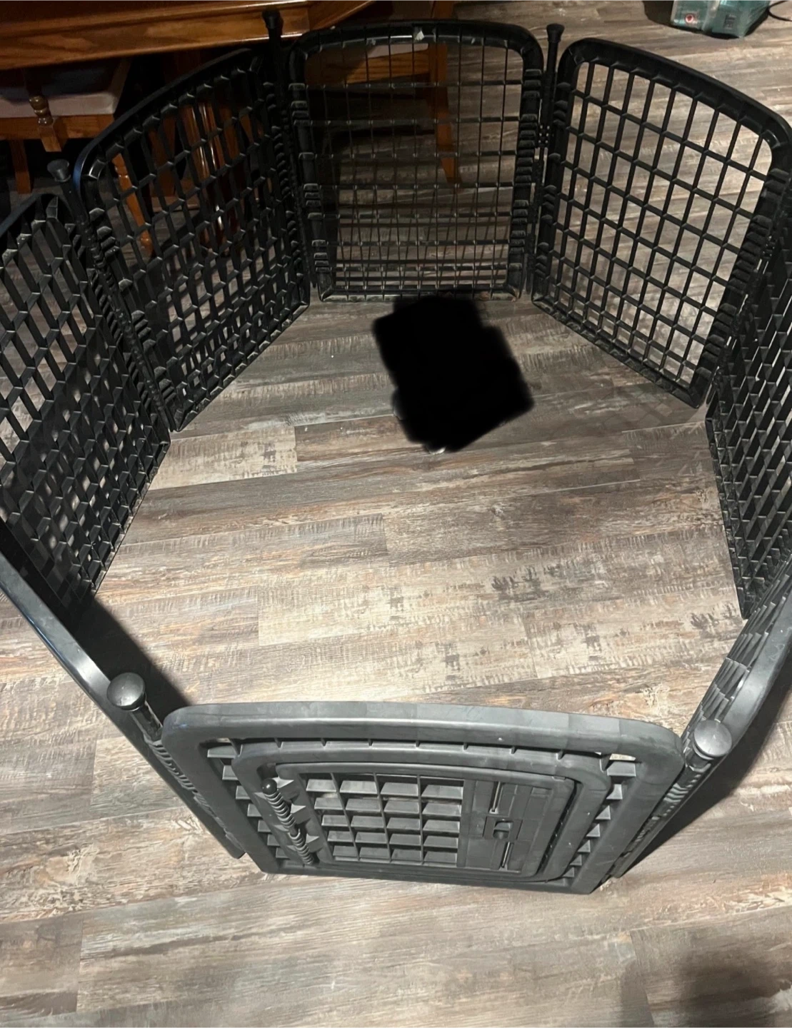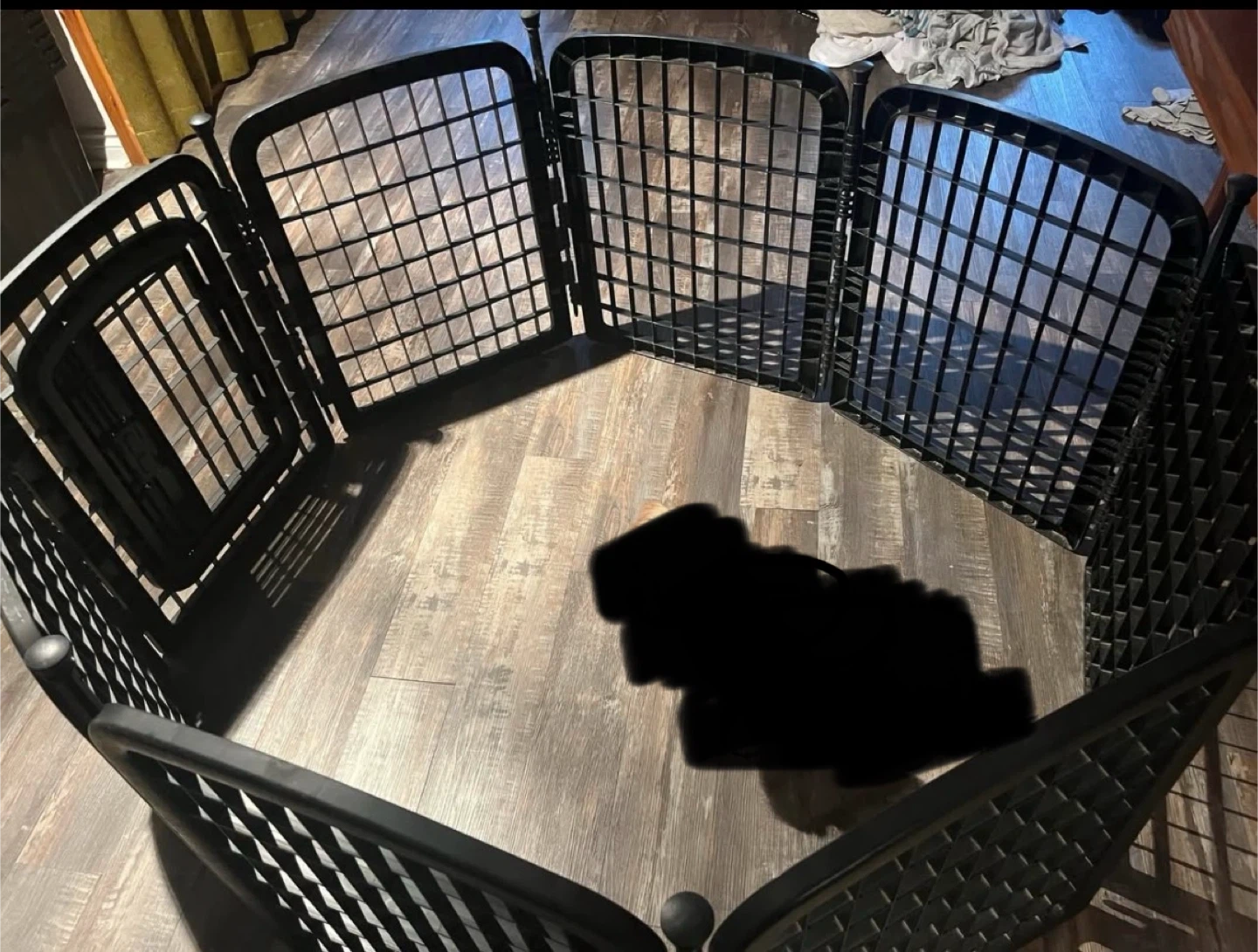 10Gently used pet playpen with 8 panels and a convenient gate. Although some parts show signs of chewing, the playpen remains sturdy and functional.