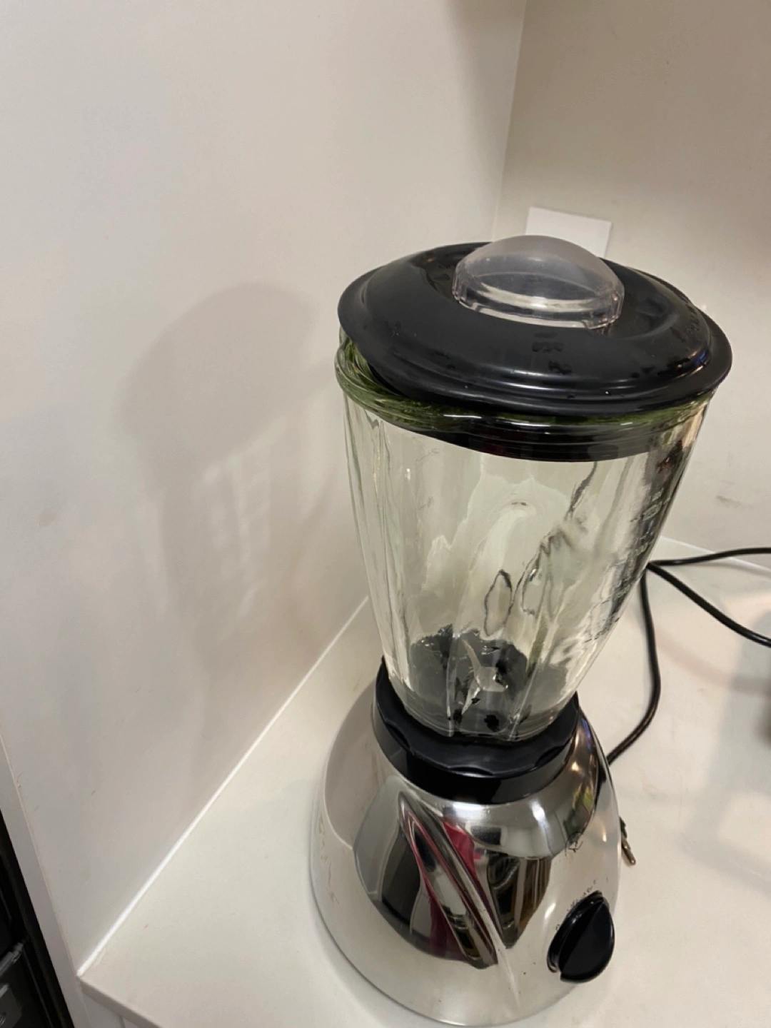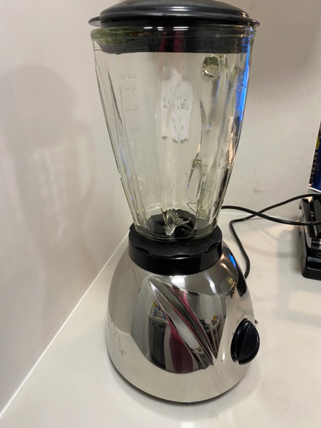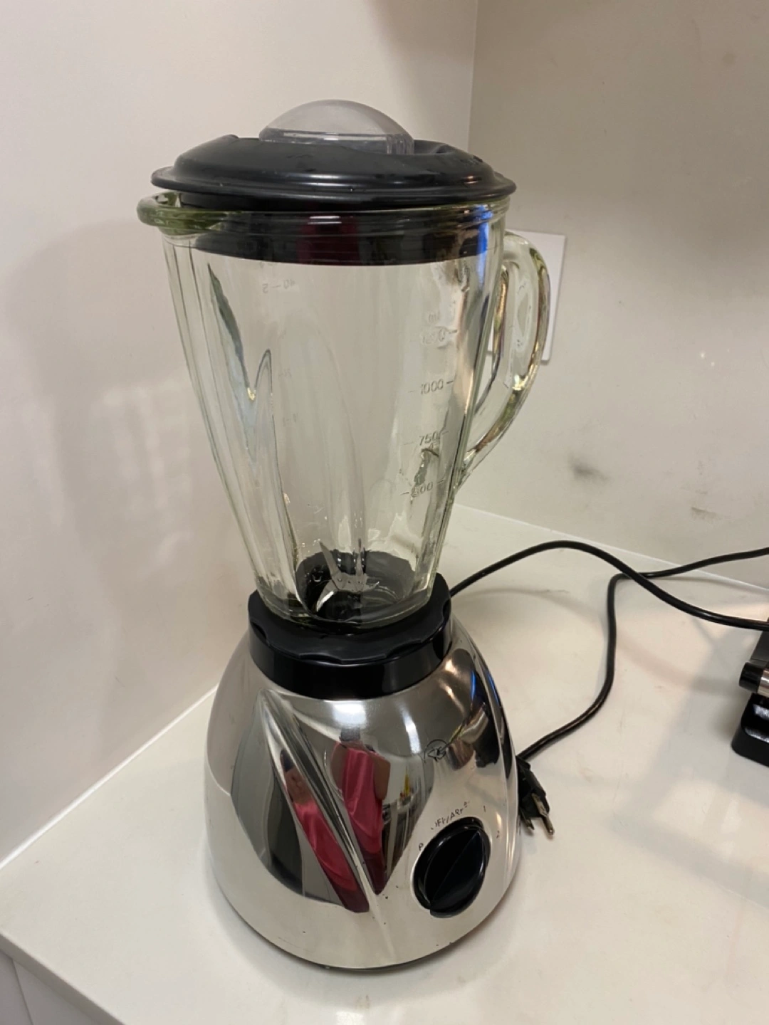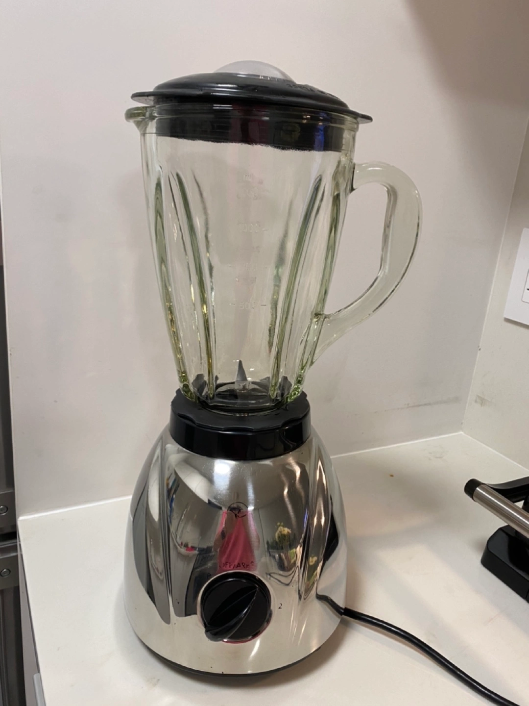 Stainless steel blender with glass jar. Has a knob to adjust speed.
