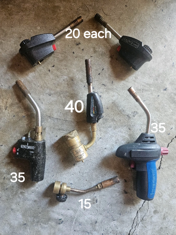10Selling a few used blow torches. Prices are marked on the image or 40 or best offer for all . Brands include BernzOmatic and TurboTorch middle and blue handle sold