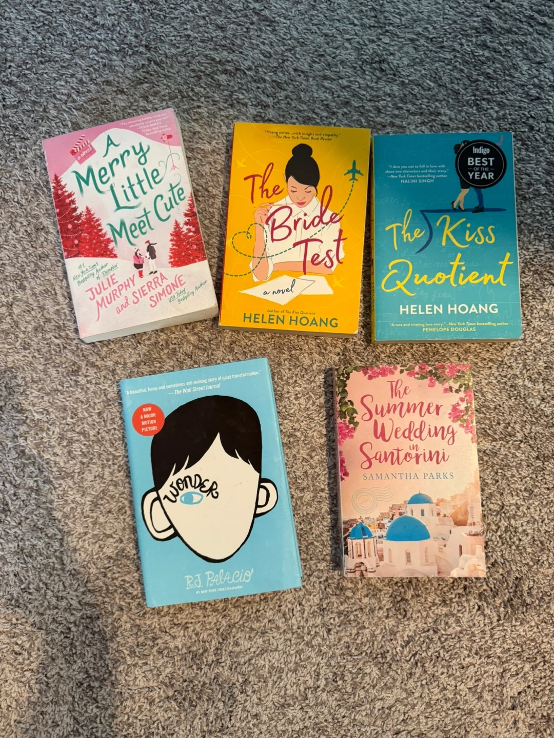 18Selling a lot of used books! $10 each or all 5 for $40 Includes: - A Merry Little Meet Cute by Julie Murphy and Sierra Simone - The Bride Test by Helen Hoang - The Kiss Quotient by Helen Hoang - Wonder by R.J. Palacio - The Summer Wedding in Santorini by Samantha Parks