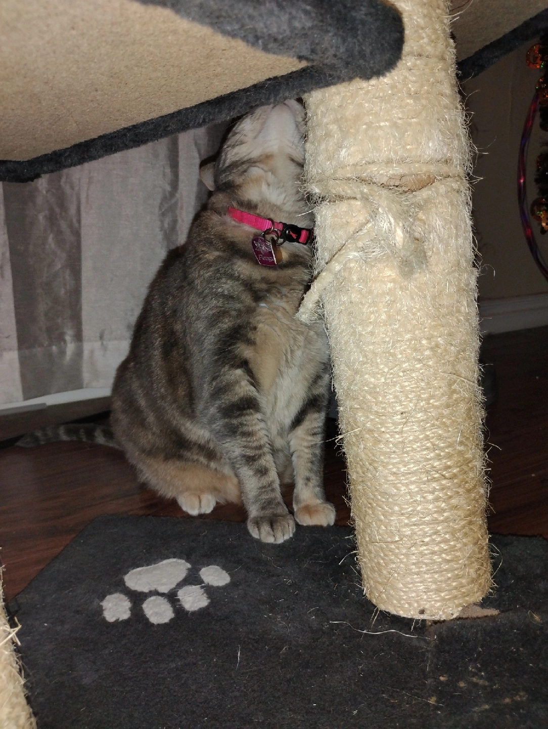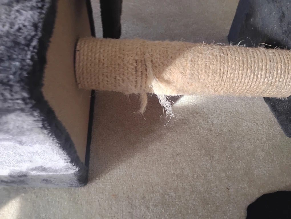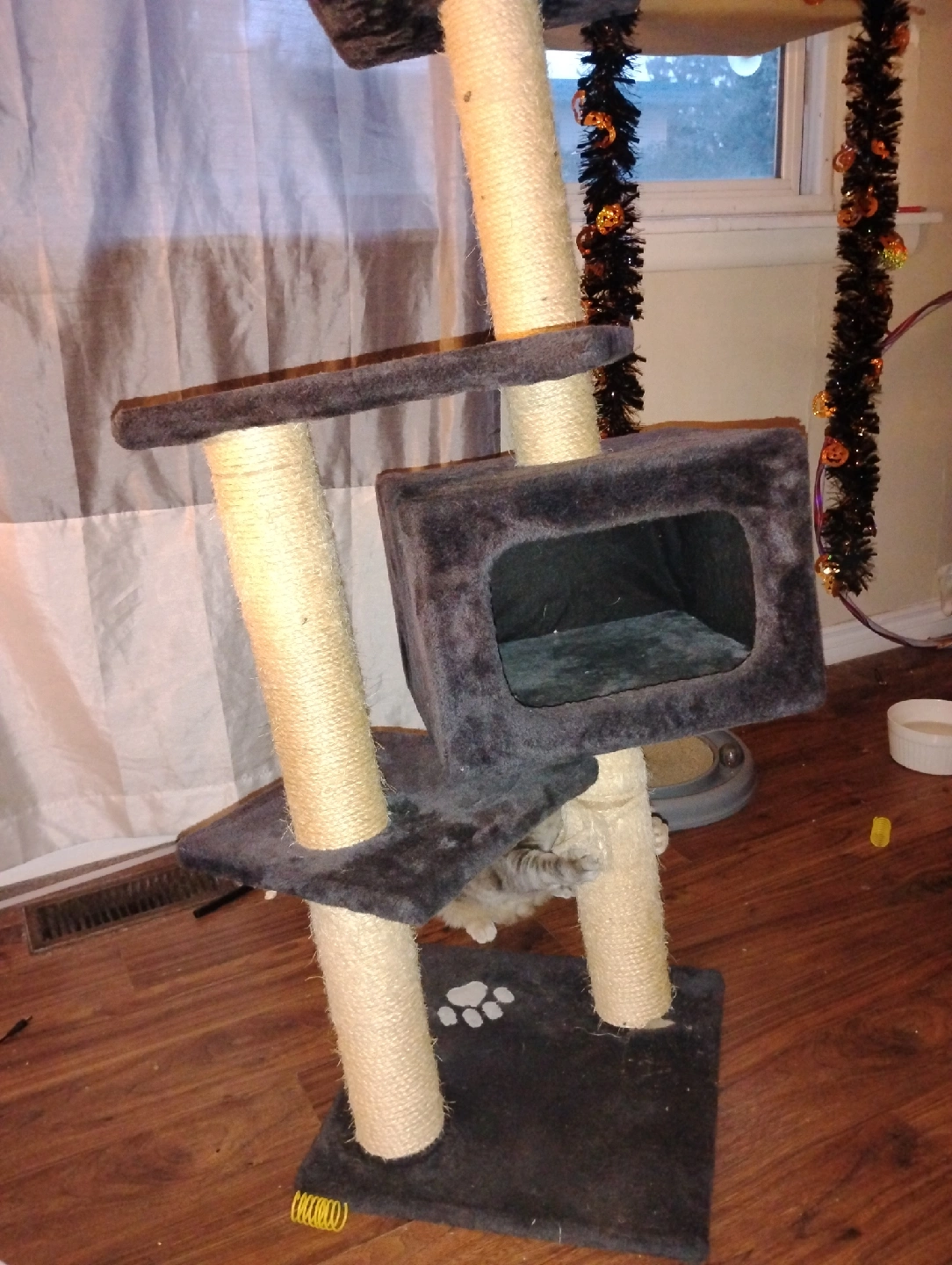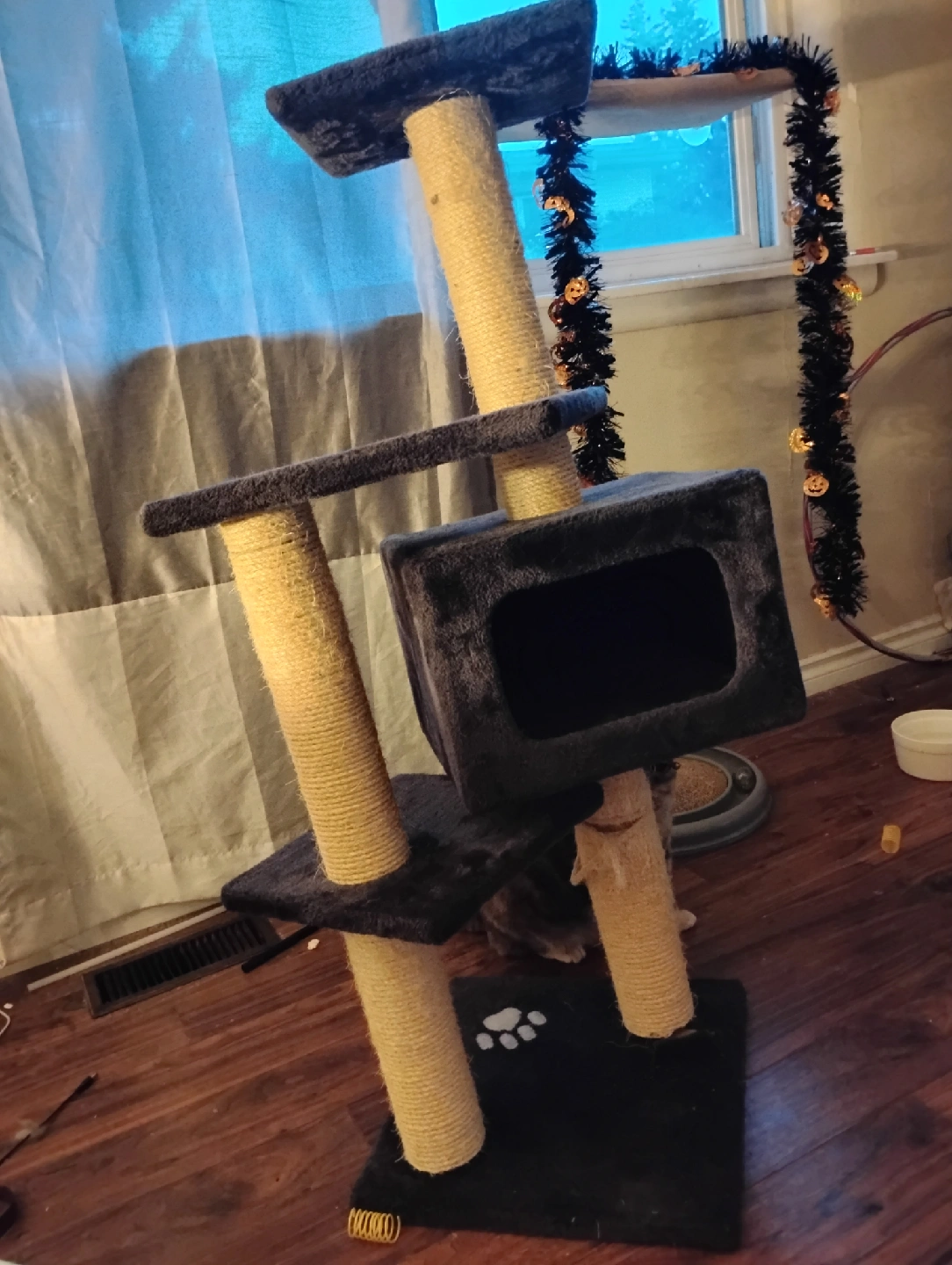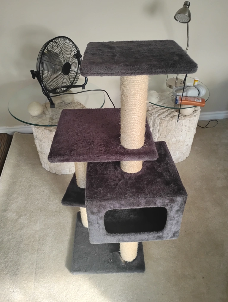 Selling a used cat tree with a scratching post. It's in fair condition, showing some signs of wear on the scratching posts. Could still be a great addition to your home for your furry friend!