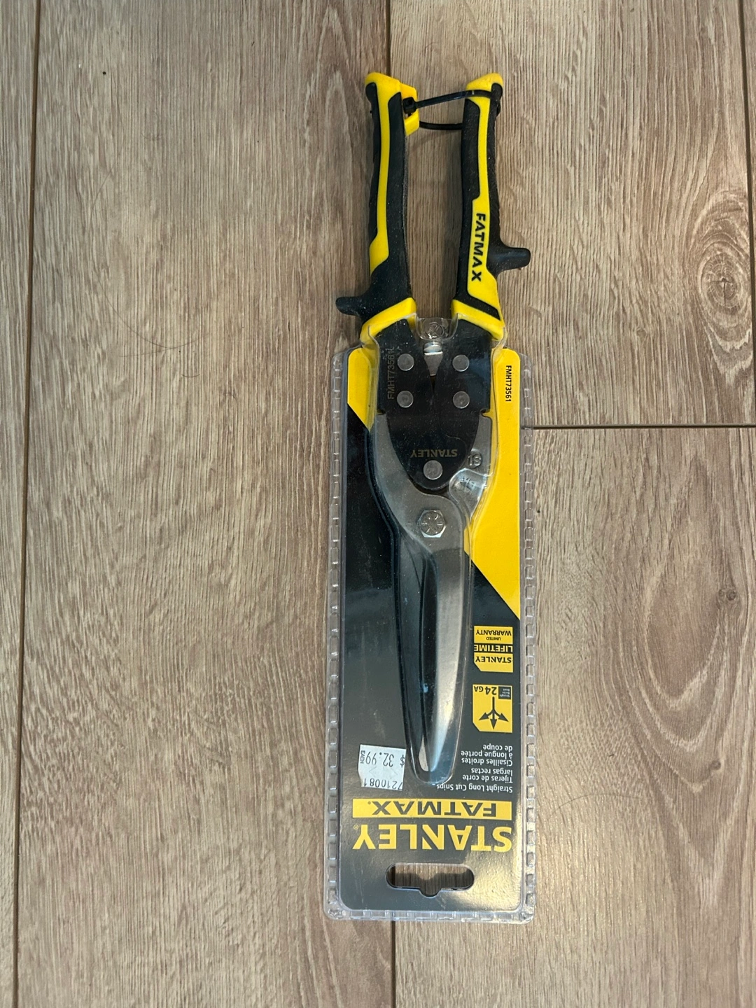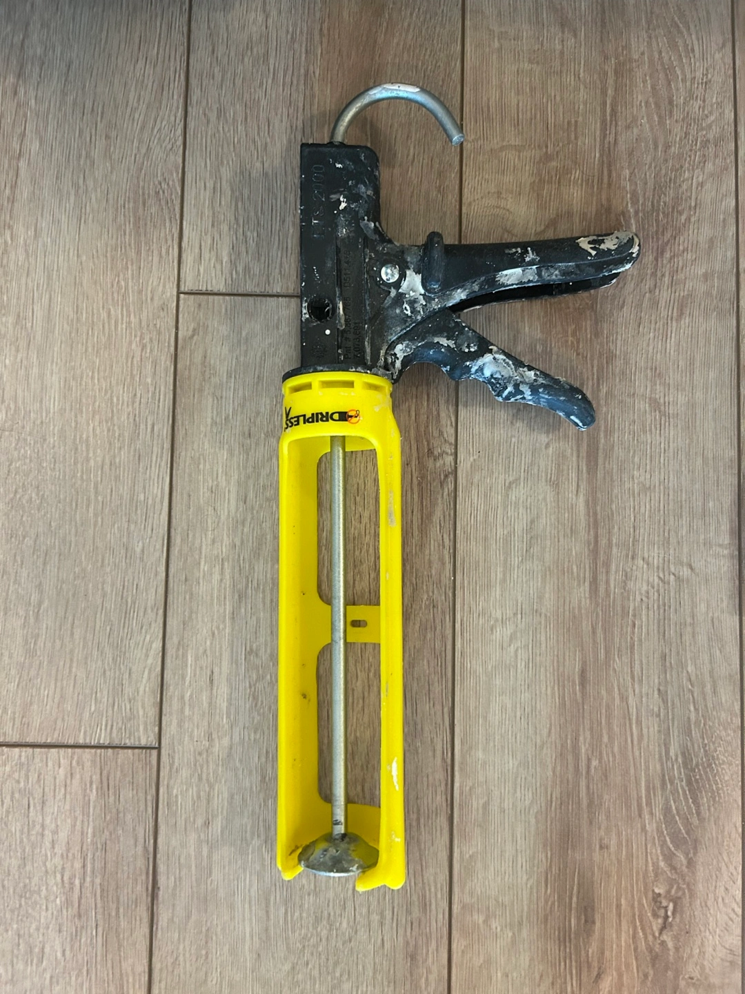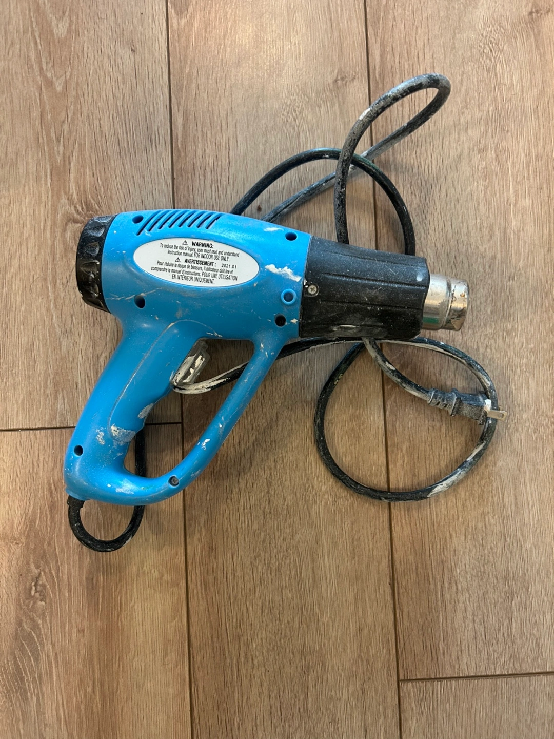13Assorted used tools. Dripless caulking gun shows wear. Pelican brand paint tray, well-used. Blue heat gun shows paint splatters. Stanley Fatmax tin snips, new in package. Pair of Irwin Quick-Grip clamps, used.