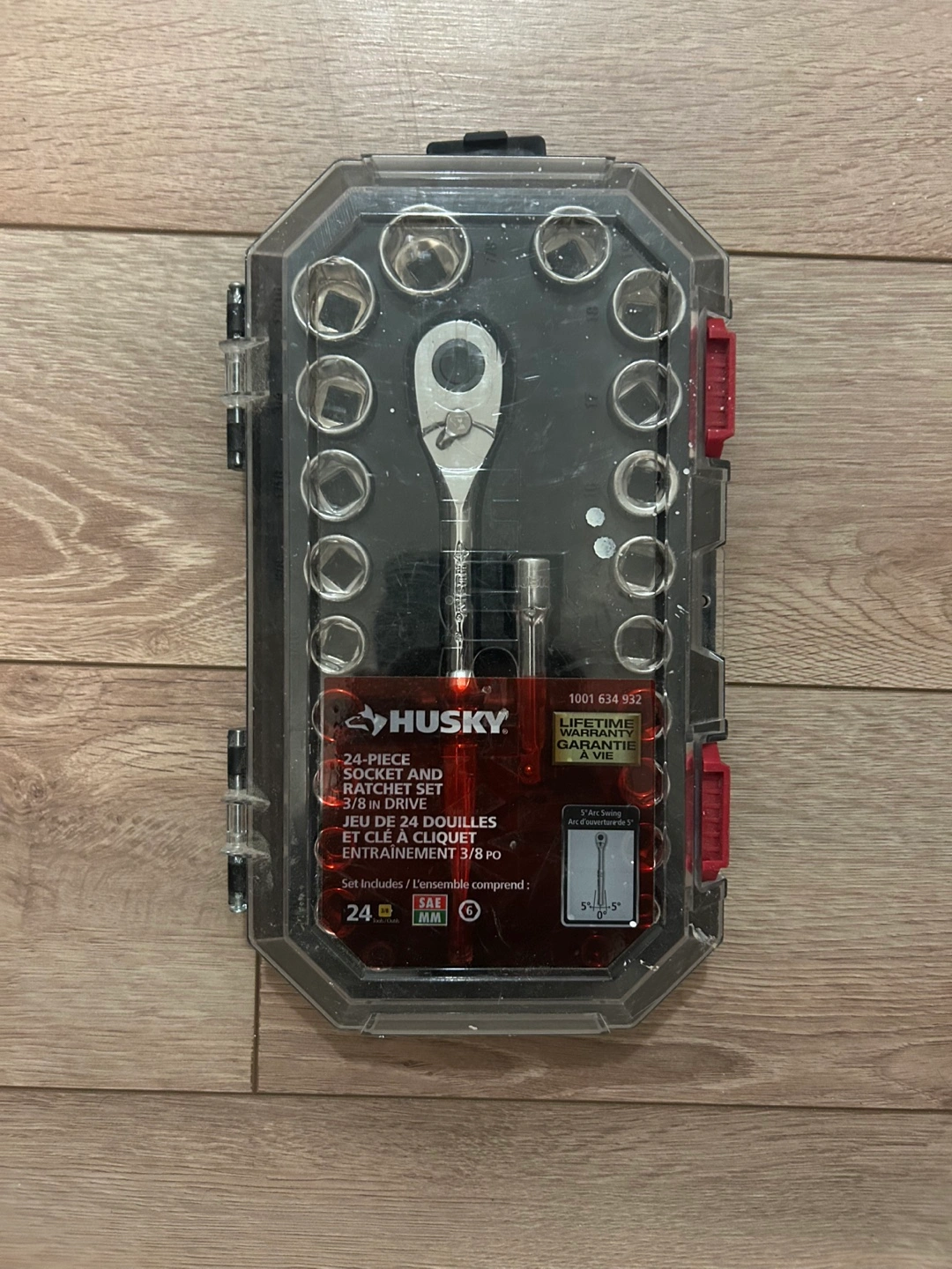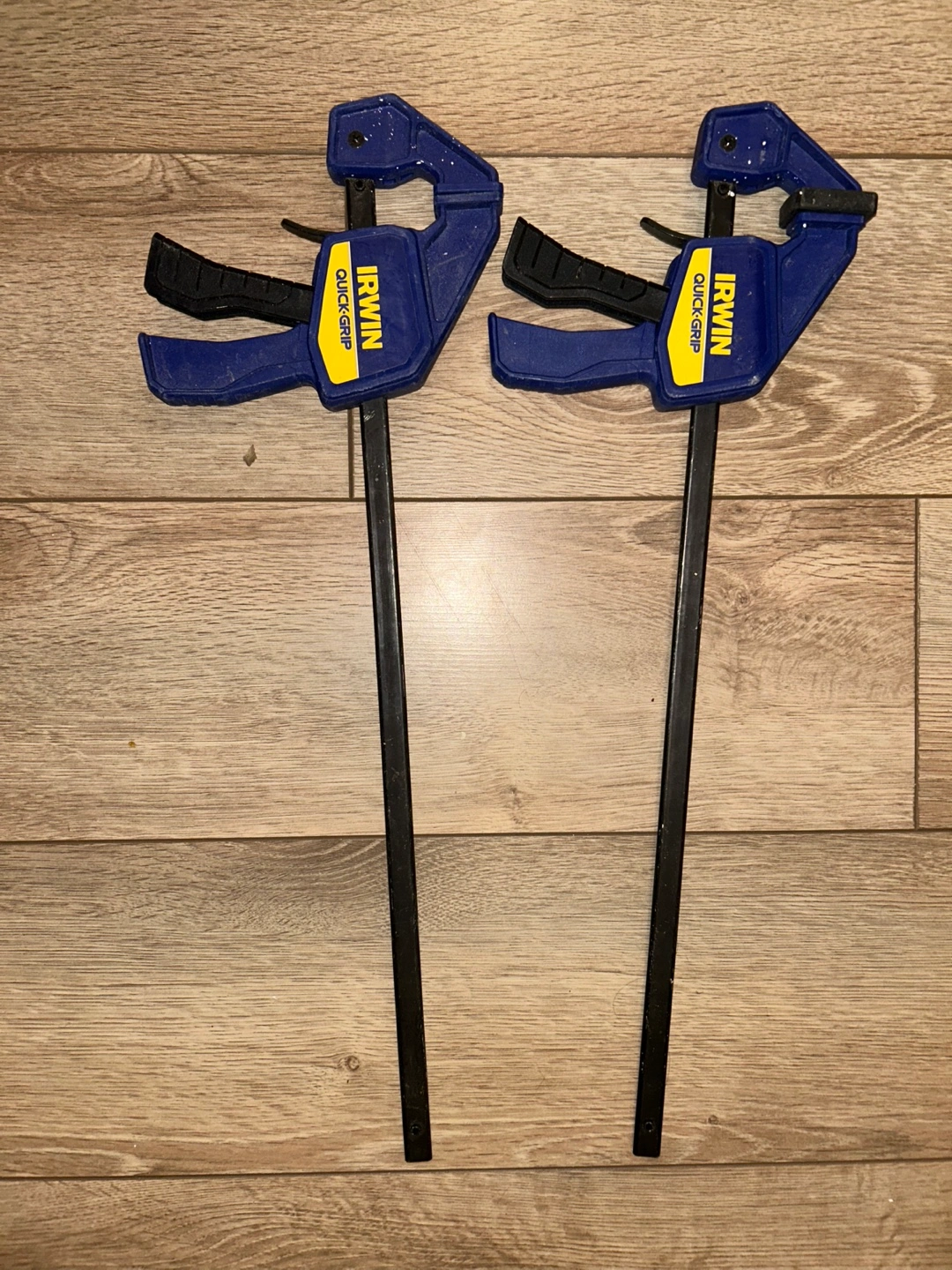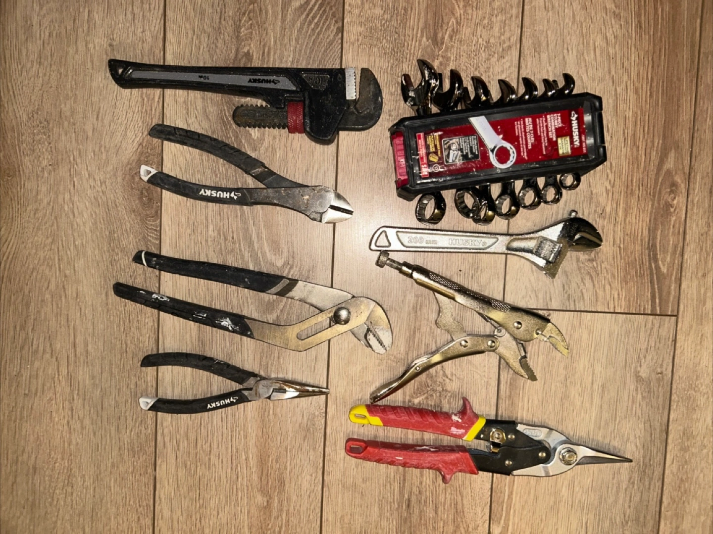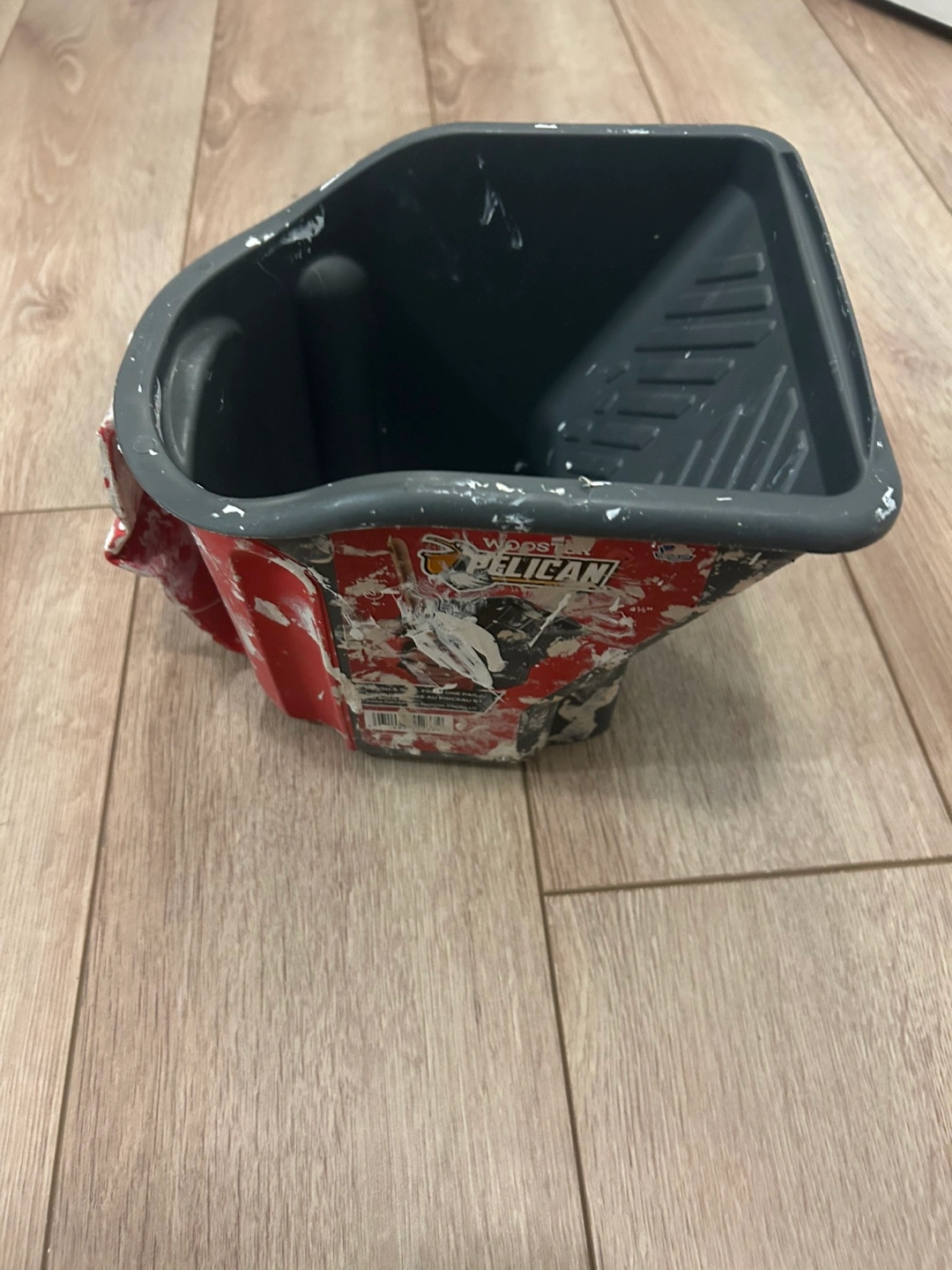 13Assorted used tools. Dripless caulking gun shows wear. Pelican brand paint tray, well-used. Blue heat gun shows paint splatters. Stanley Fatmax tin snips, new in package. Pair of Irwin Quick-Grip clamps, used.
