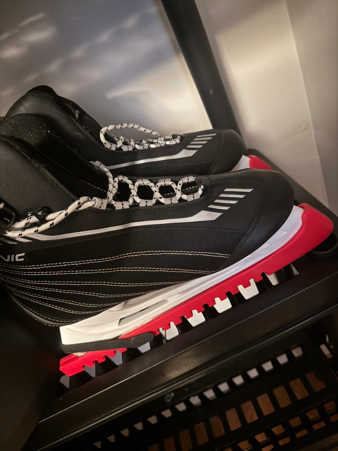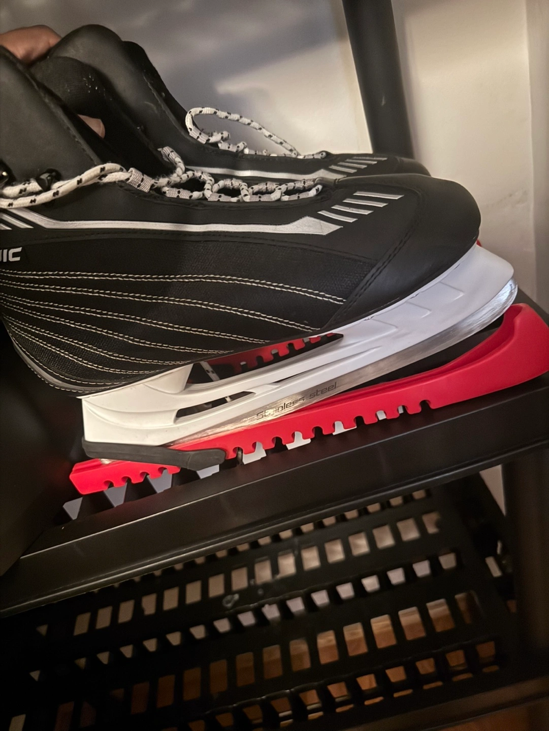 Pair of used CCM figure skates. Black with white accents. Includes skate guards. Good condition.