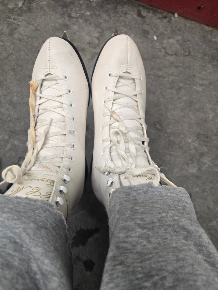 15Pair of white figure skates. Lace-up closure. Some wear and tear visible. Good condition.