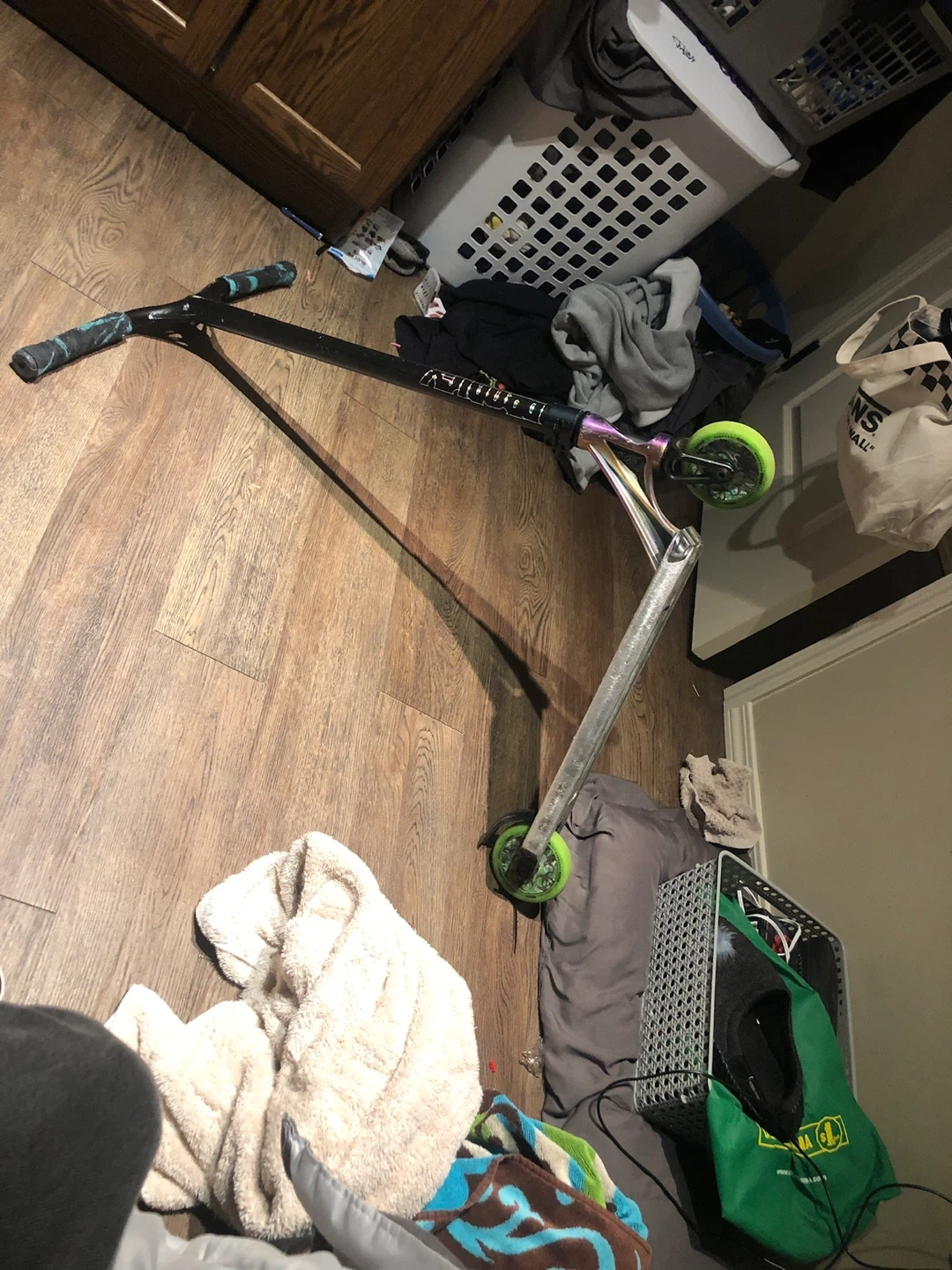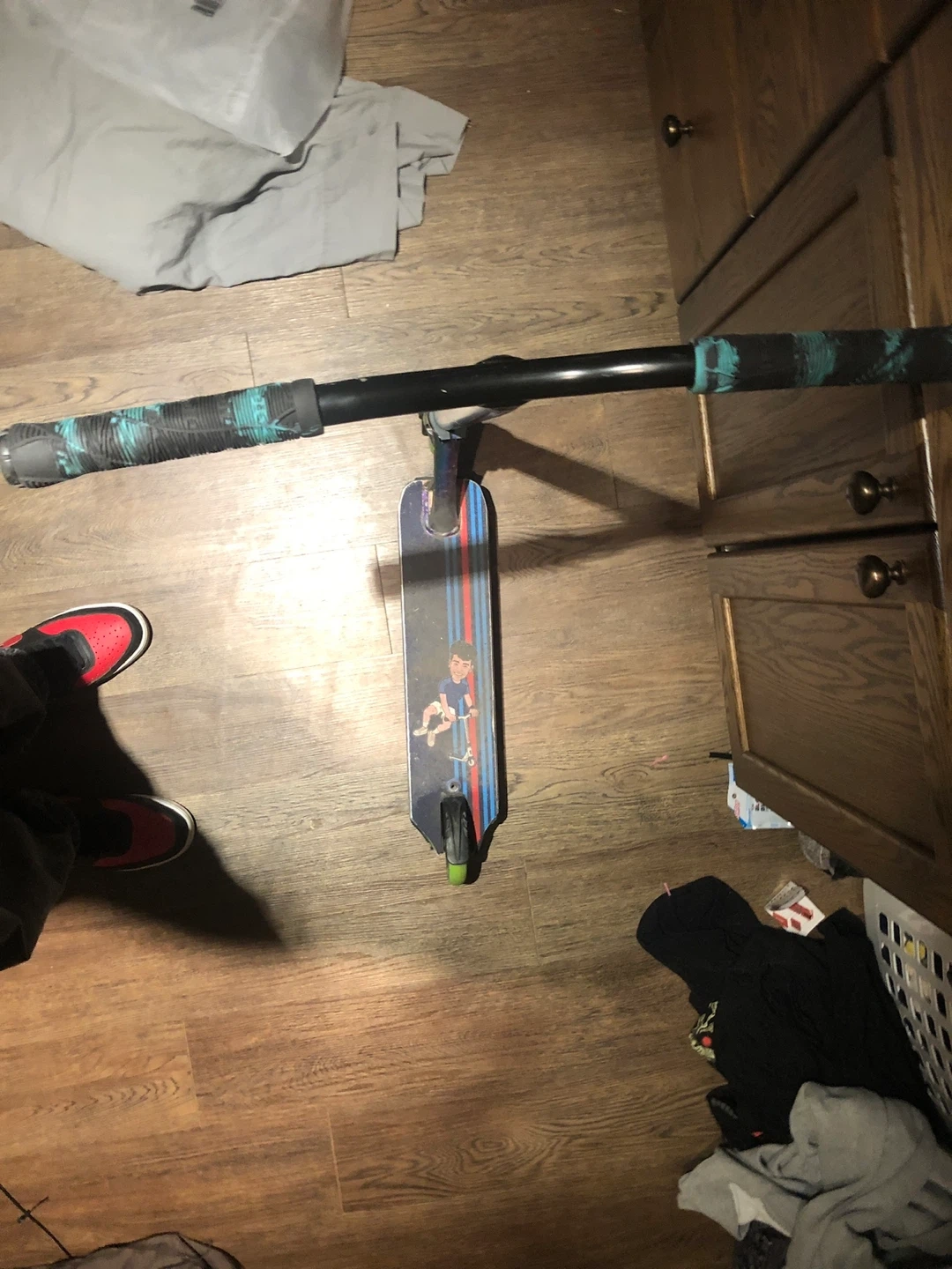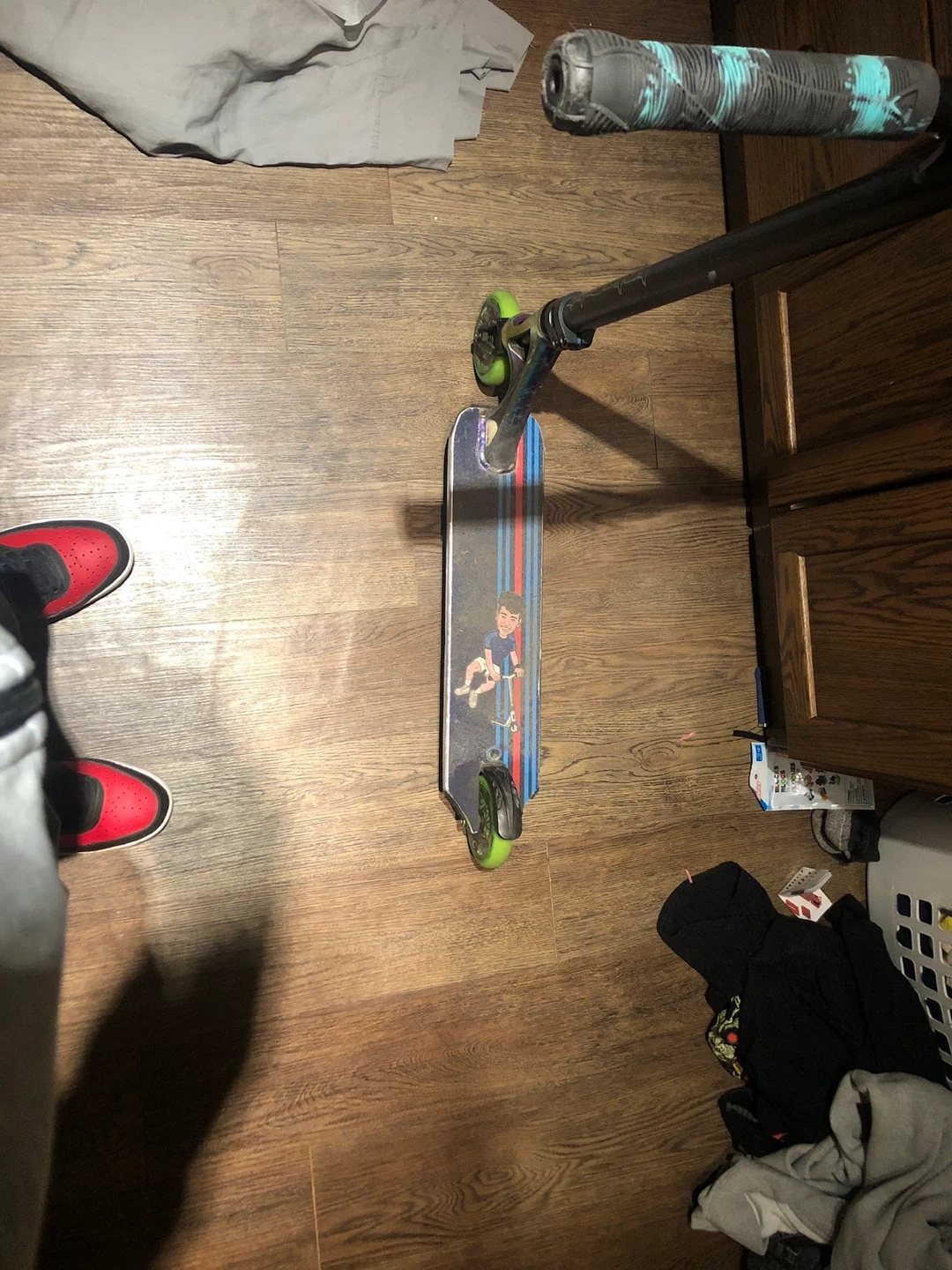 10Selling a used freestyle scooter. It has a black handlebar and a deck with a design. The wheels are green. Good for doing tricks at the skate park!