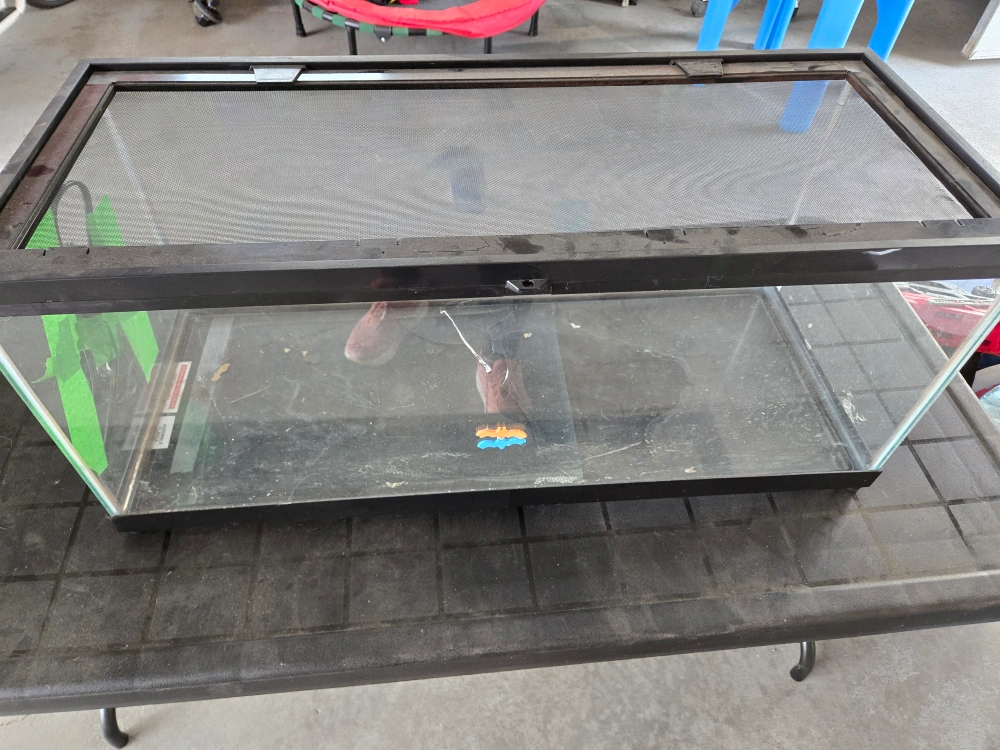 Selling a used glass terrarium. It has a black frame and a mesh top, perfect for reptiles or small animals. The tank is in fair condition with some signs of use.