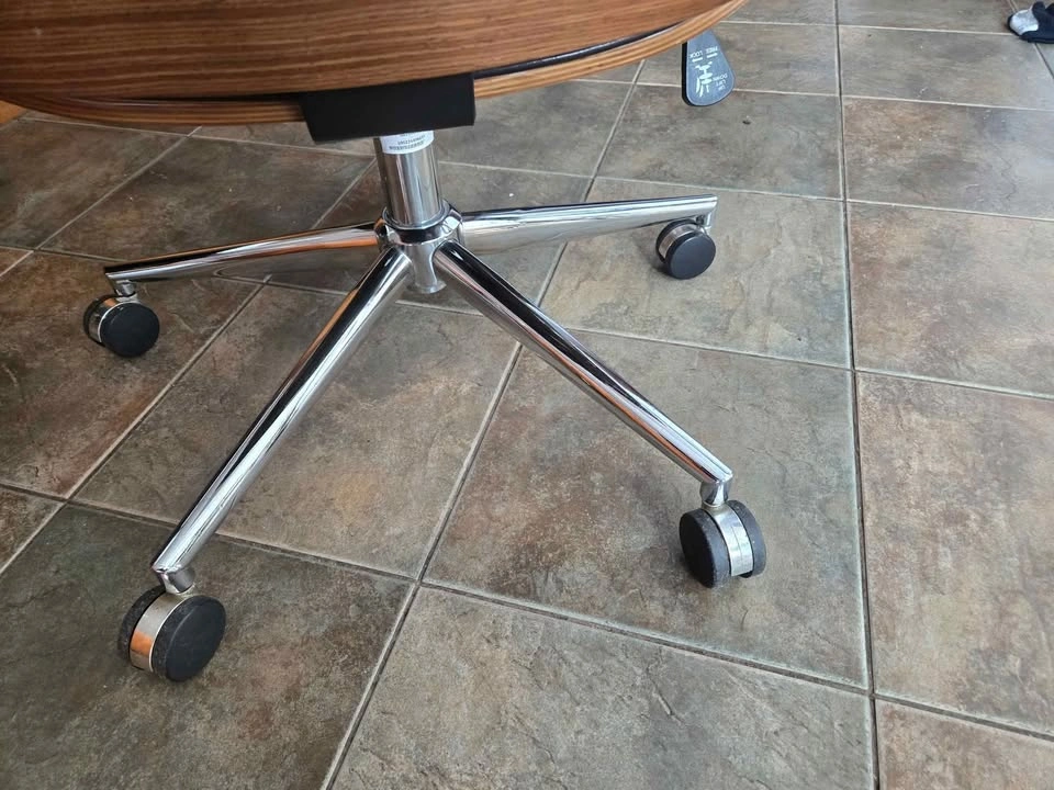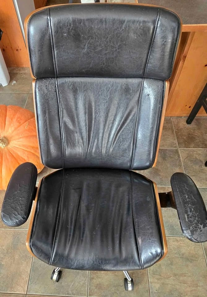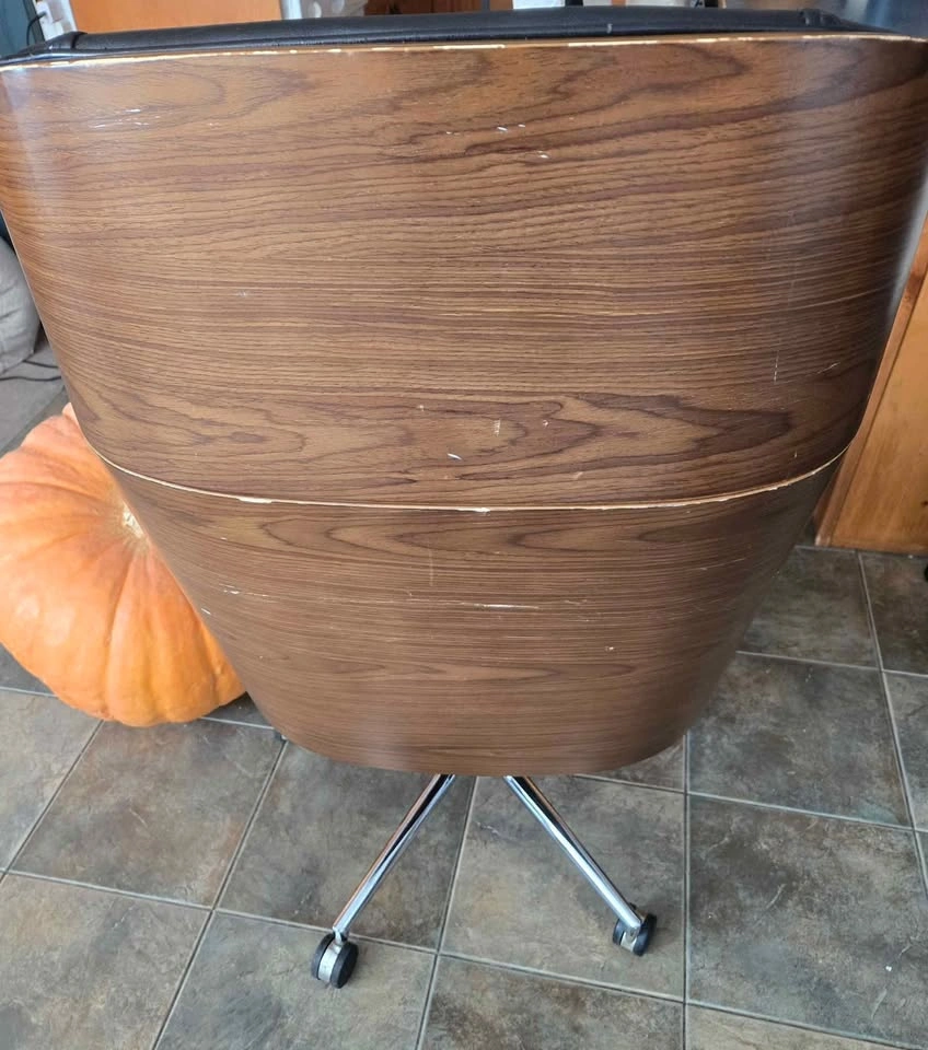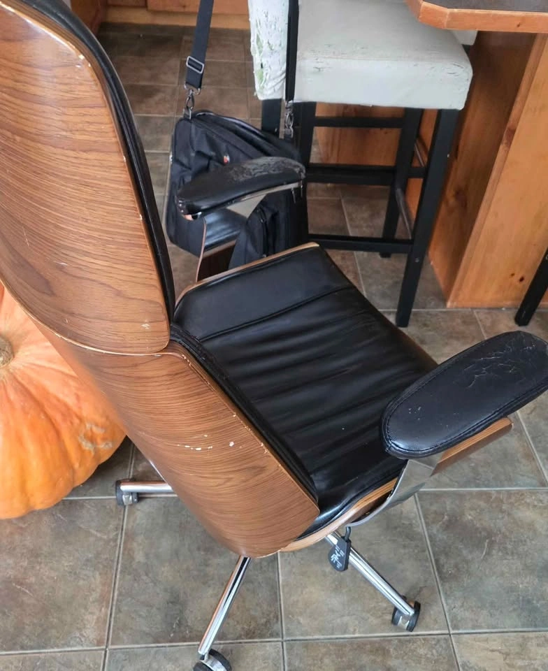 Selling Used Jysk Mid Century Modern Office Rolling Chair with Armrests and Walnut Back. Rolling wheels, backrest lock and height adjust mechanism all in good working order. No loose parts. Armrests are quite used up but otherwise still in very good condition with defects on leather and wood all shown in pictures. Lots of life left!
