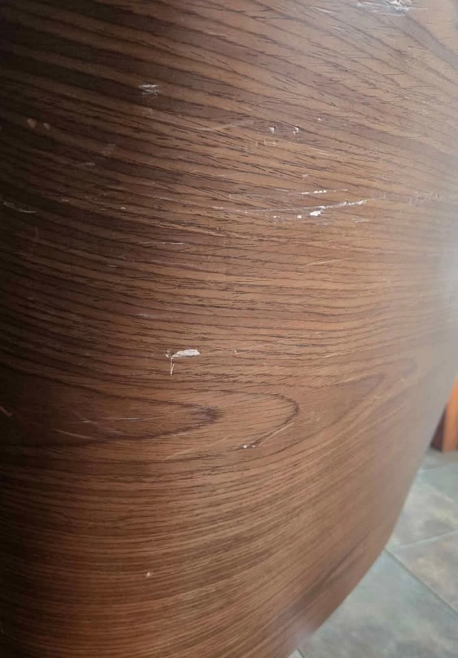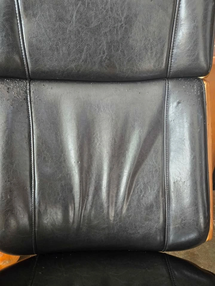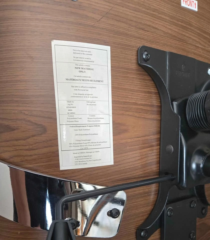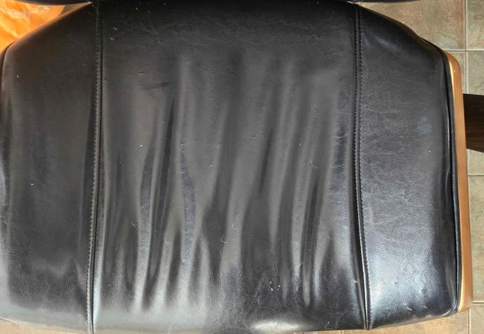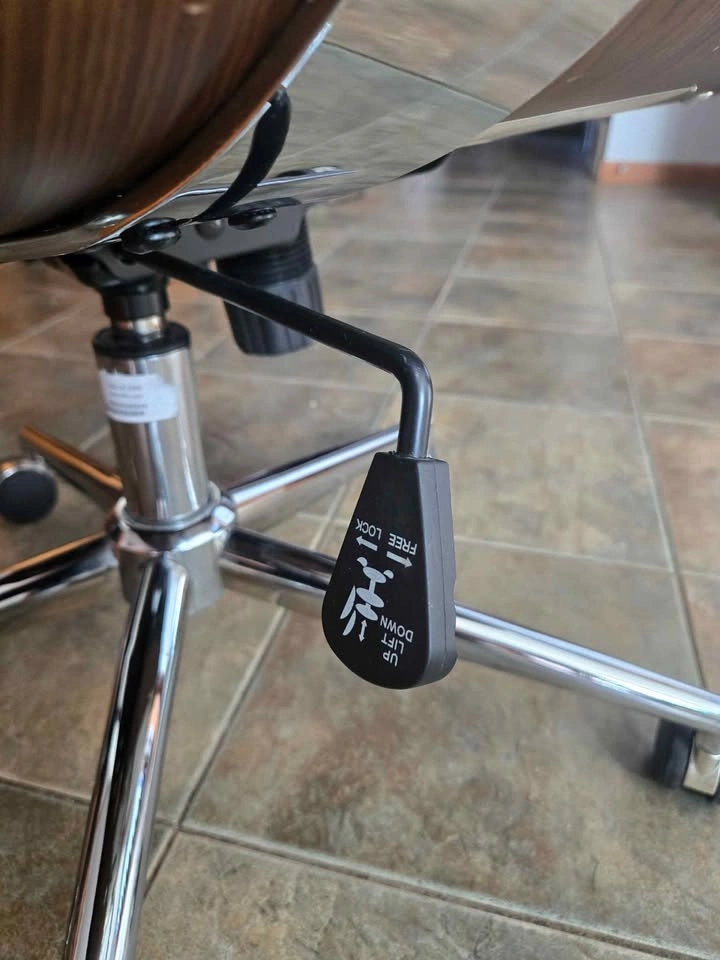 Selling Used Jysk Mid Century Modern Office Rolling Chair with Armrests and Walnut Back. Rolling wheels, backrest lock and height adjust mechanism all in good working order. No loose parts. Armrests are quite used up but otherwise still in very good condition with defects on leather and wood all shown in pictures. Lots of life left!