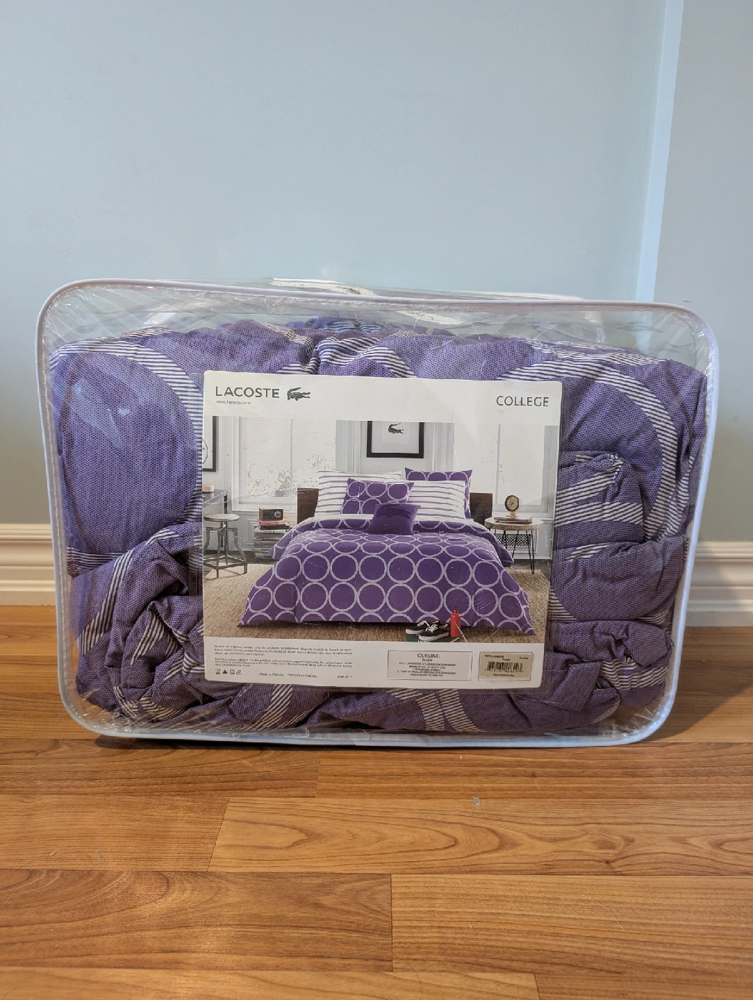 36USED Lacoste College bedding set. Full/Queen comforter plus 2 standard shams. It features a cool purple and white "Curling" design. Pictured in its original packaging, but has been used.