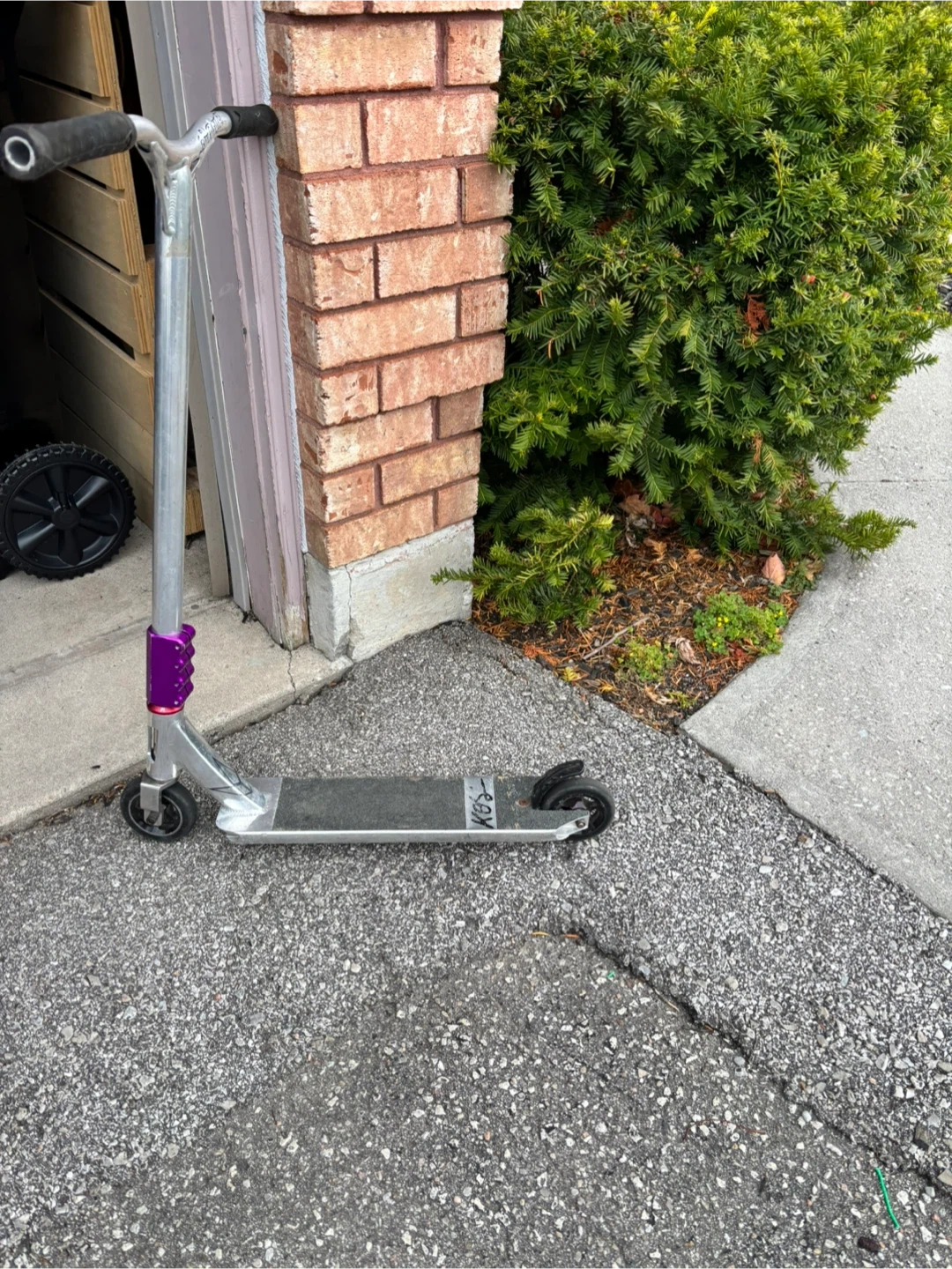 10Selling a used scooter in silver and purple! It shows some signs of wear, but it's still a fun ride. Great for getting around the neighbourhood or practicing tricks at the park