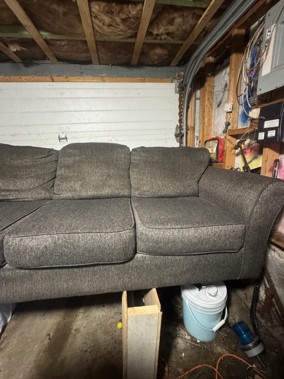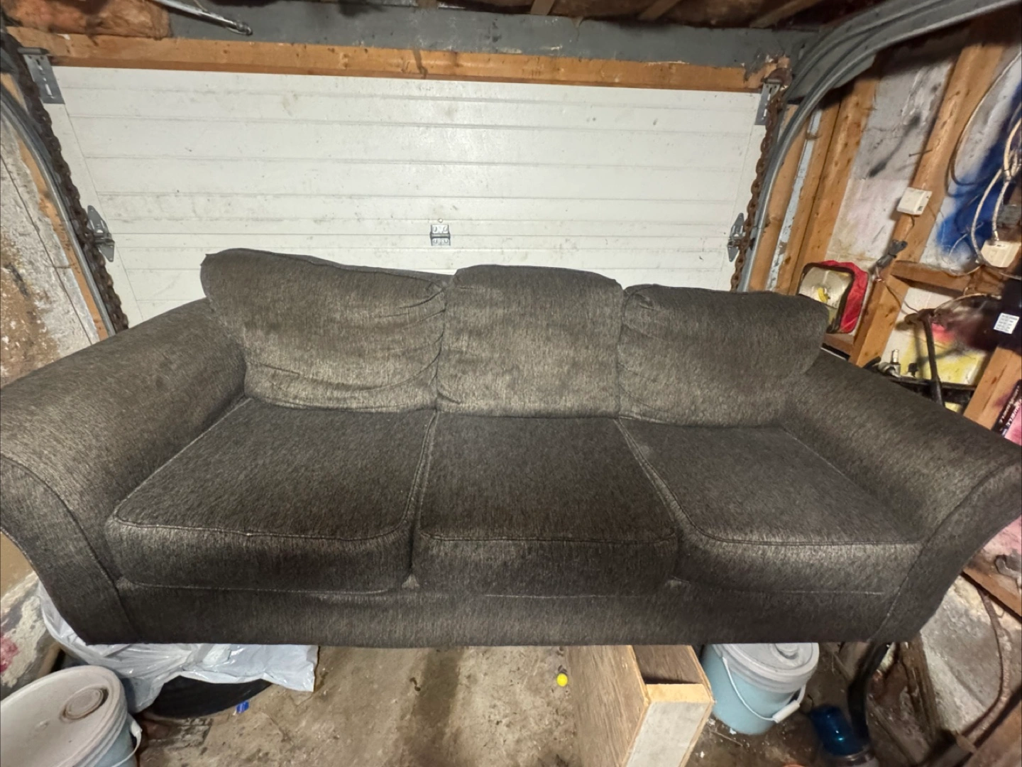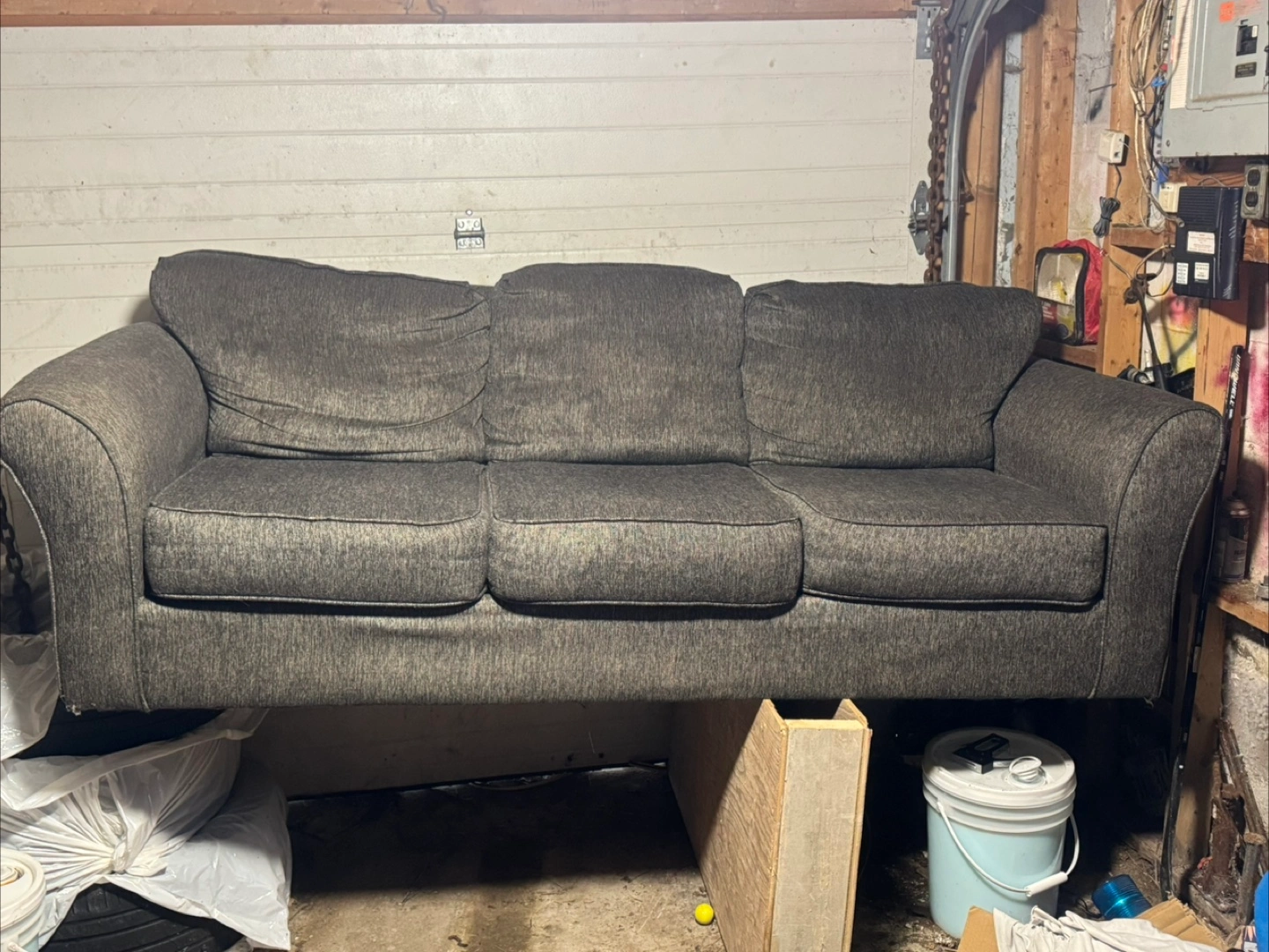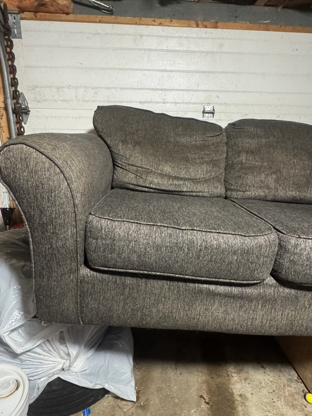 Three-seater sofa. Dark grey fabric upholstery. Rolled arms. Good used condition. Bought 2 months ago from market place didn’t fit where we wanted so it’s just sitting in the basement. $400 obo