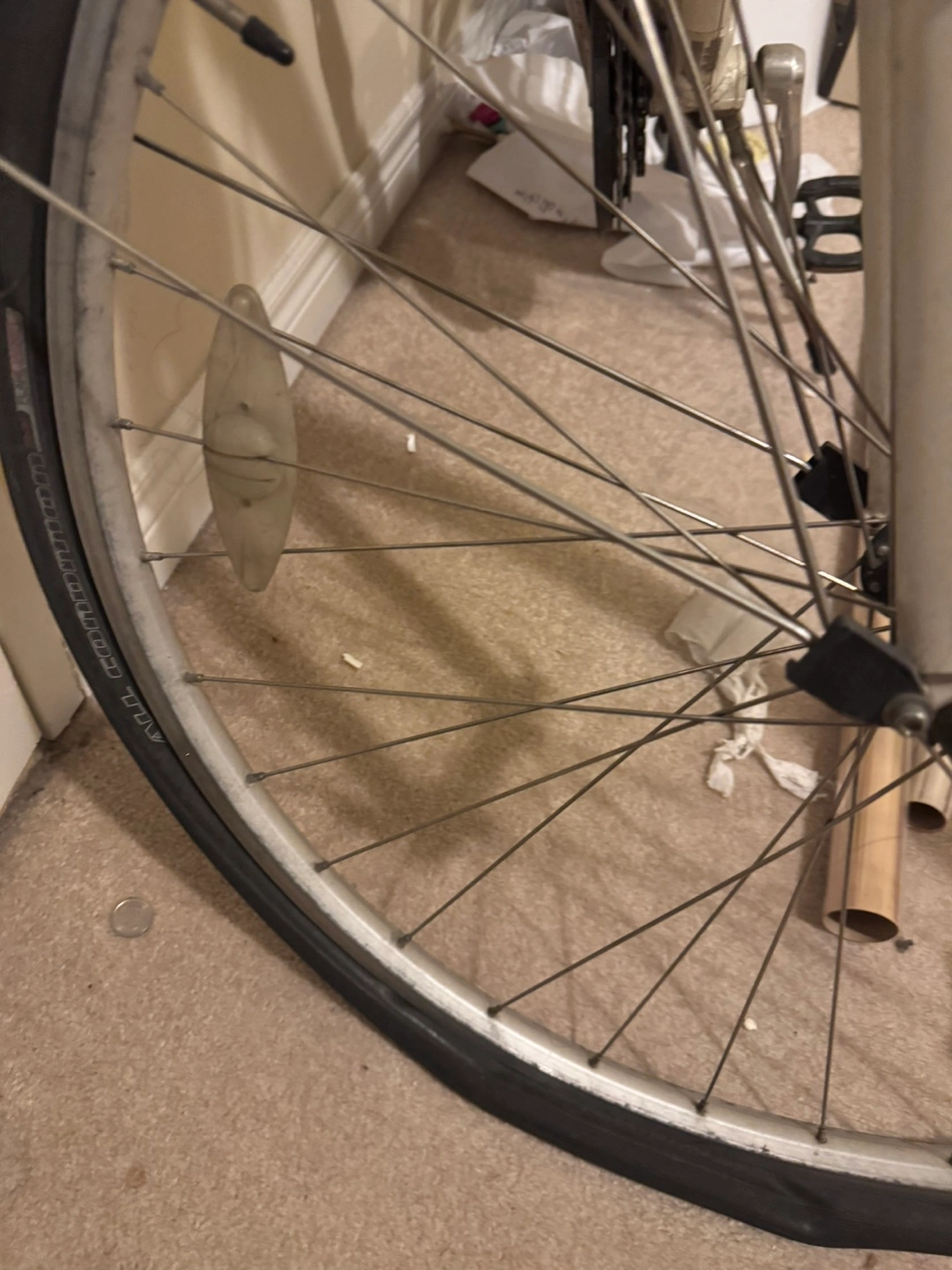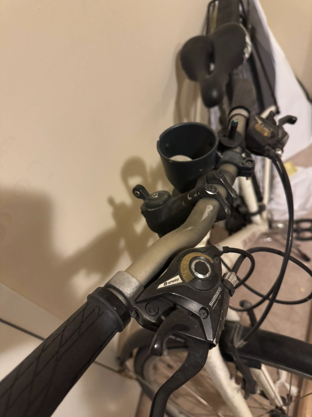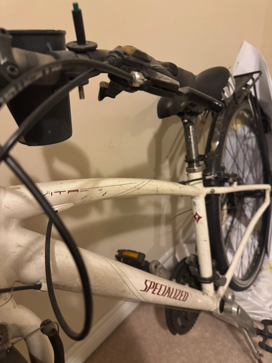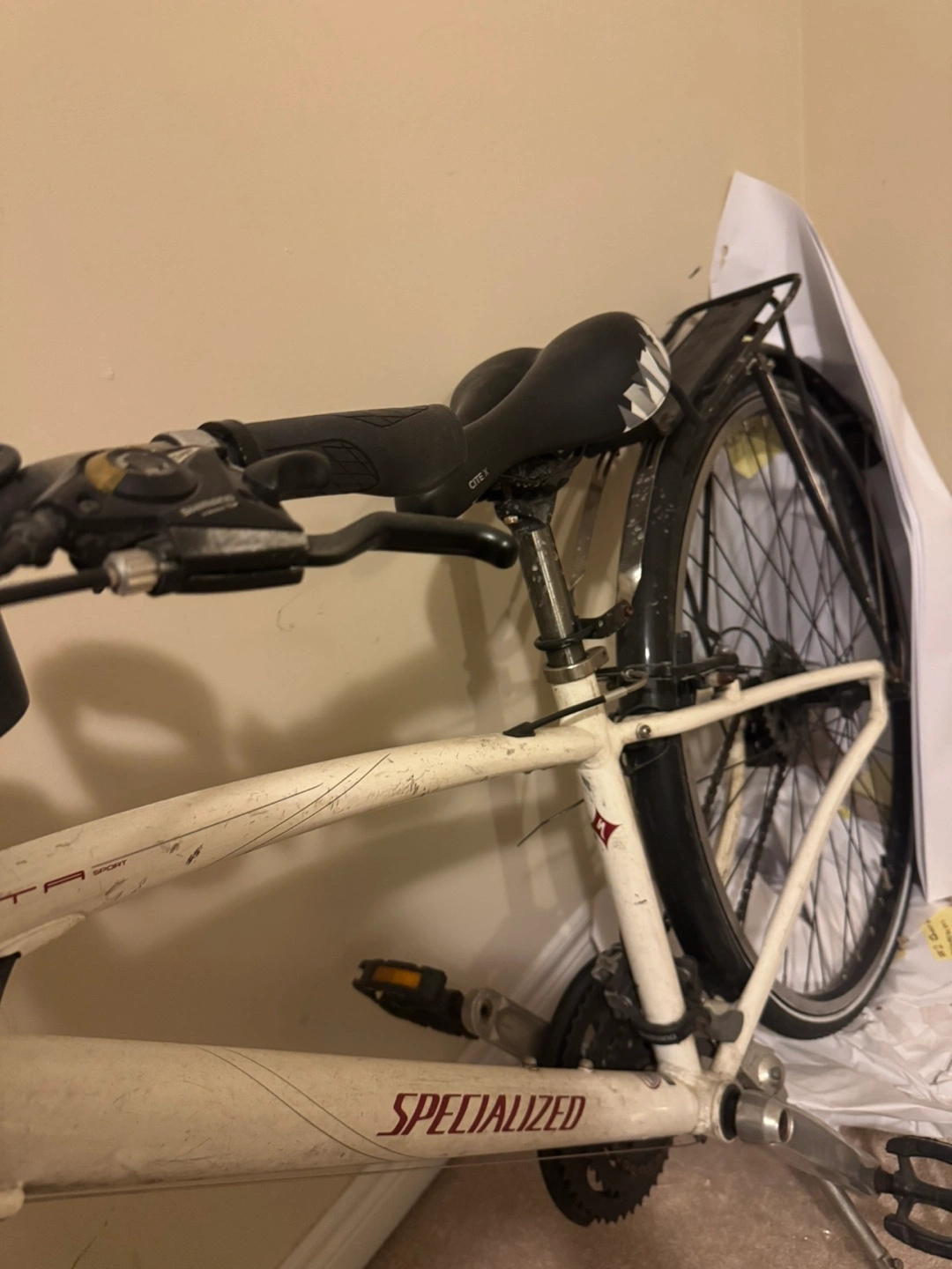 6Women's Specialized Vita Sport hybrid bicycle. White frame, Shimano 8-speed. Features a rear rack. Shows some wear and tear.