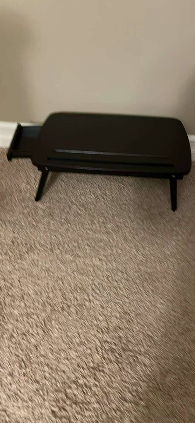 This versatile black lap desk is perfect for working or browsing from the comfort of your couch or bed. It features a handy pull-out drawer for storing small essentials. The legs fold flat for easy storage. It's a great addition to any home!