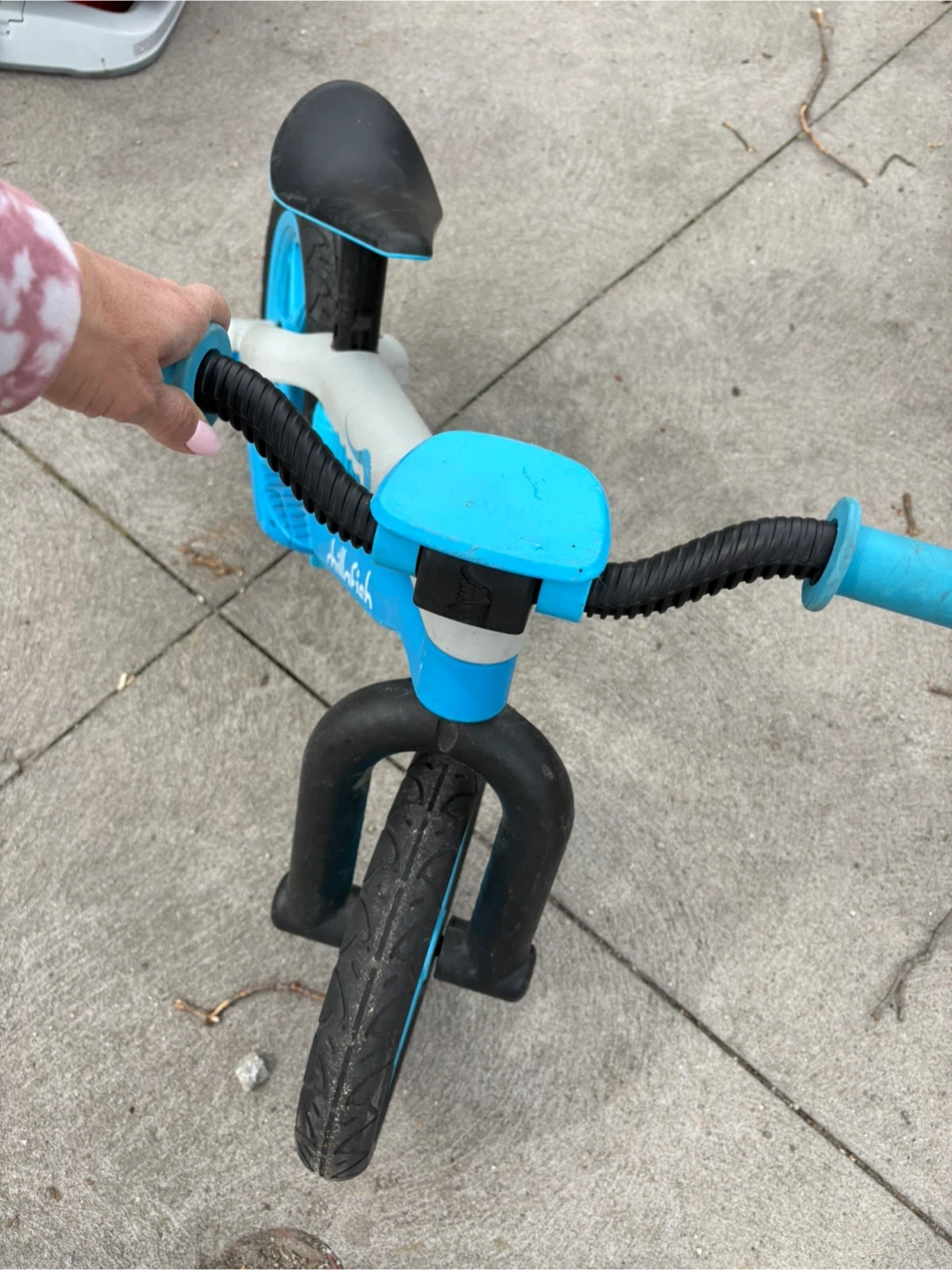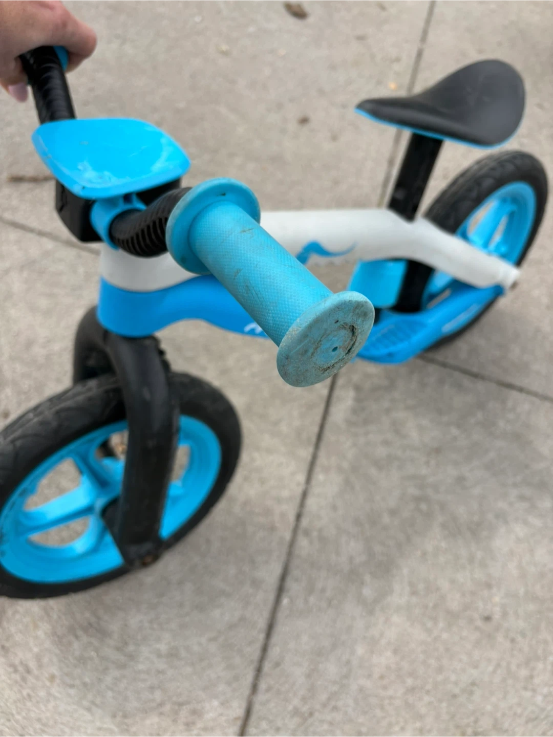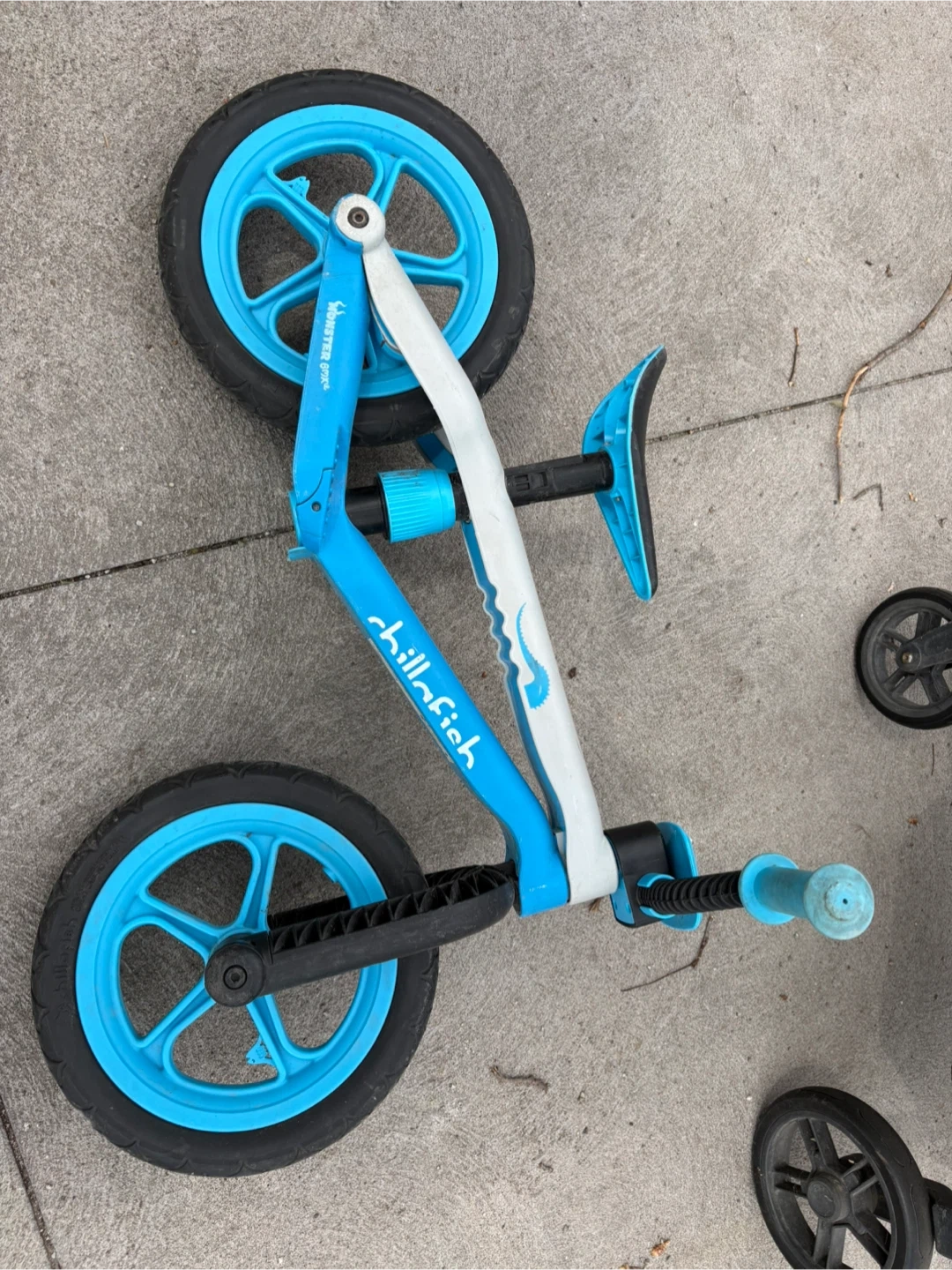 This blue and white Chillafish balance bike is great for little ones learning to ride. It has a lightweight frame and easy-grip handlebars. Perfect for developing balance skills before transitioning to a pedal bike!