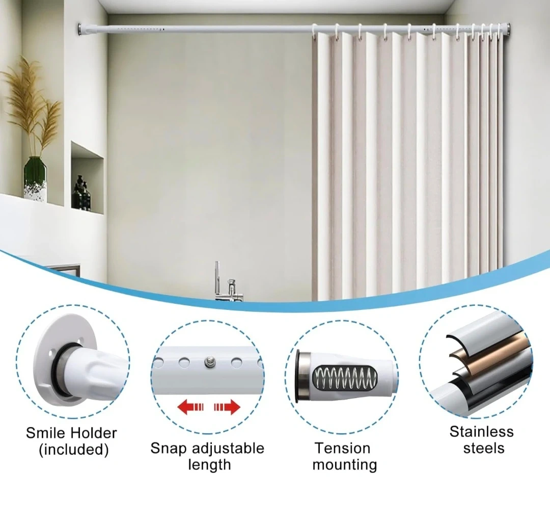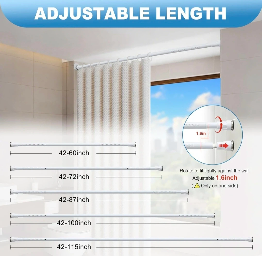 This rod is multi-functional and can be used in the bathroom, as a closet rod, a curtain rod, or even as a room divider rod. Adjustable length 42"-115"