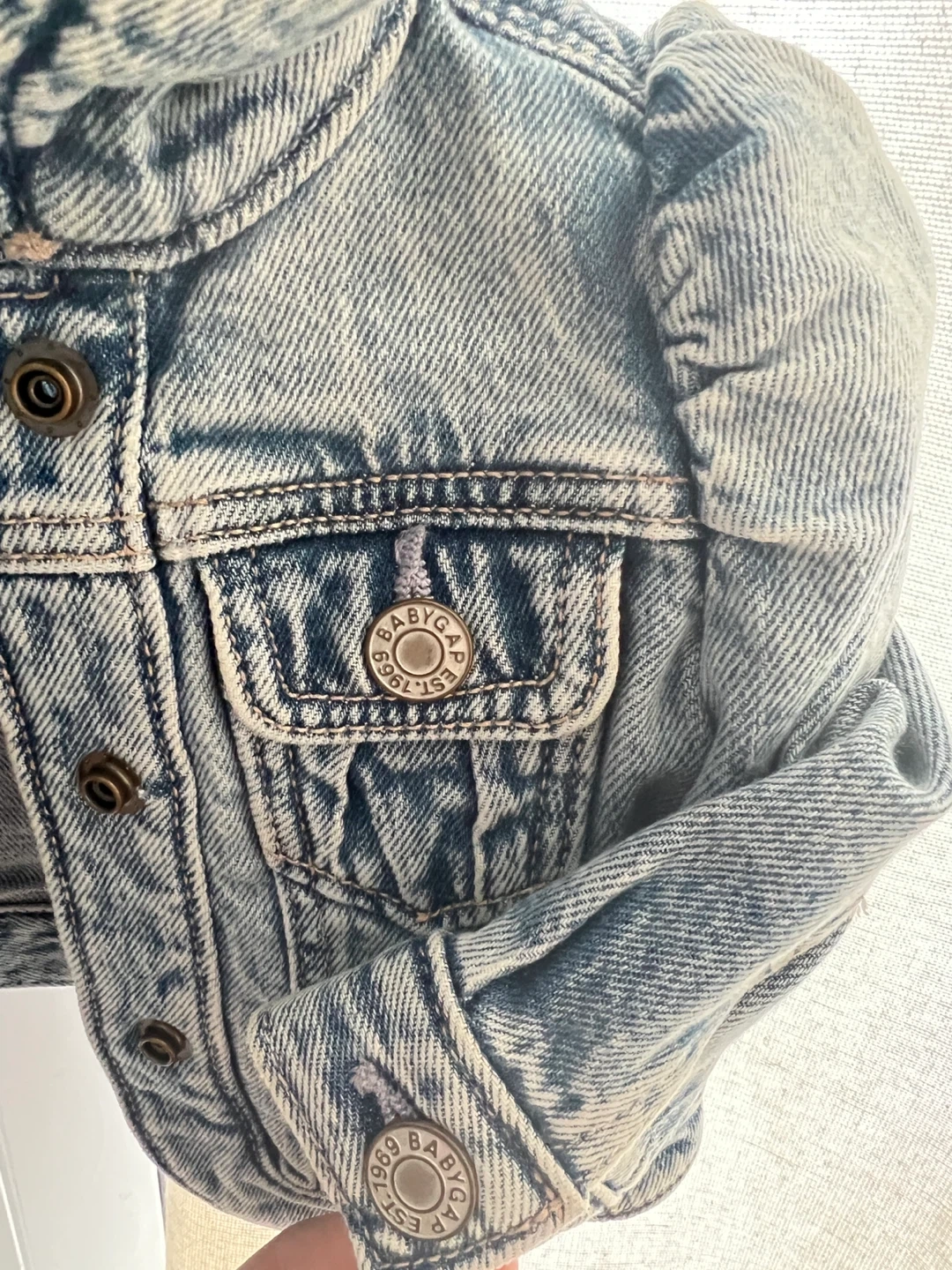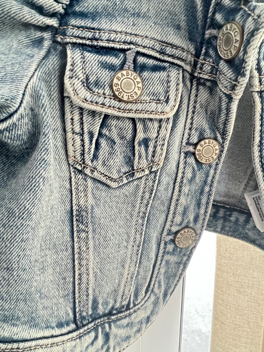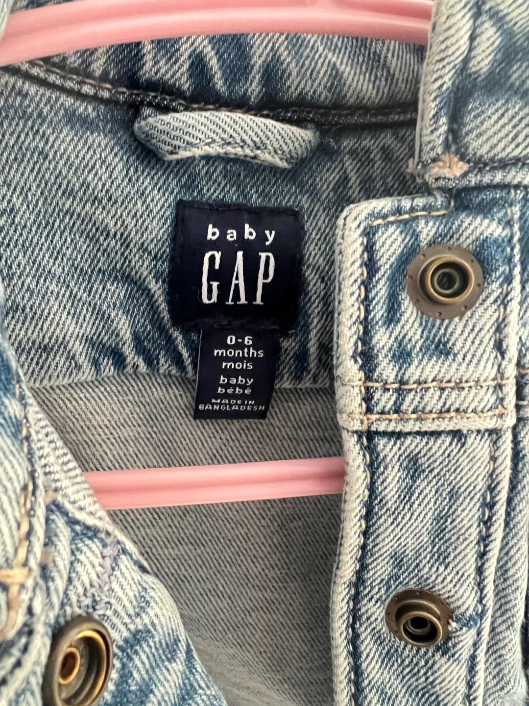 This is a cute light wash denim jacket from Baby Gap. It's sized for 0-6 months. Features button closures and chest pockets. Perfect for a little one's wardrobe!