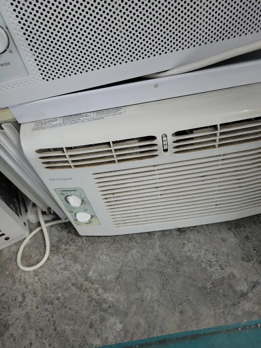 This is a Frigidaire window air conditioner unit. It has temperature control dials for setting your desired cooling level. The unit has vents on the front for air distribution.