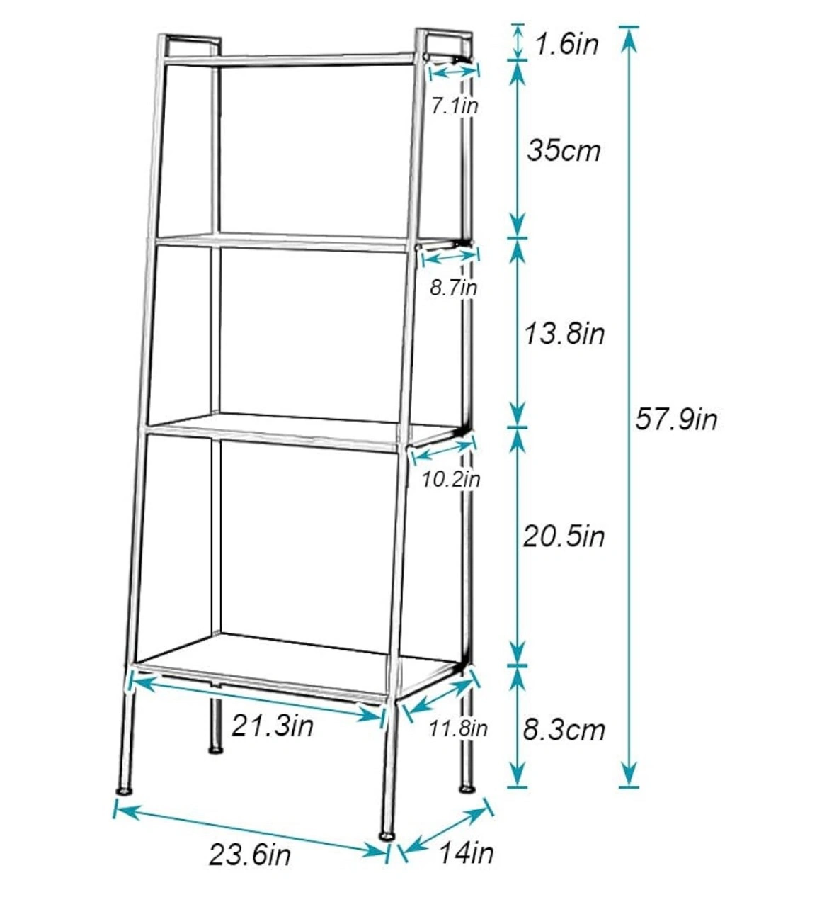 This is a great shelving unit for a bedroom or living room. It is made of metal and has a white finish. It is 57.9 inches tall and 23.6 inches wide. It has four shelves.