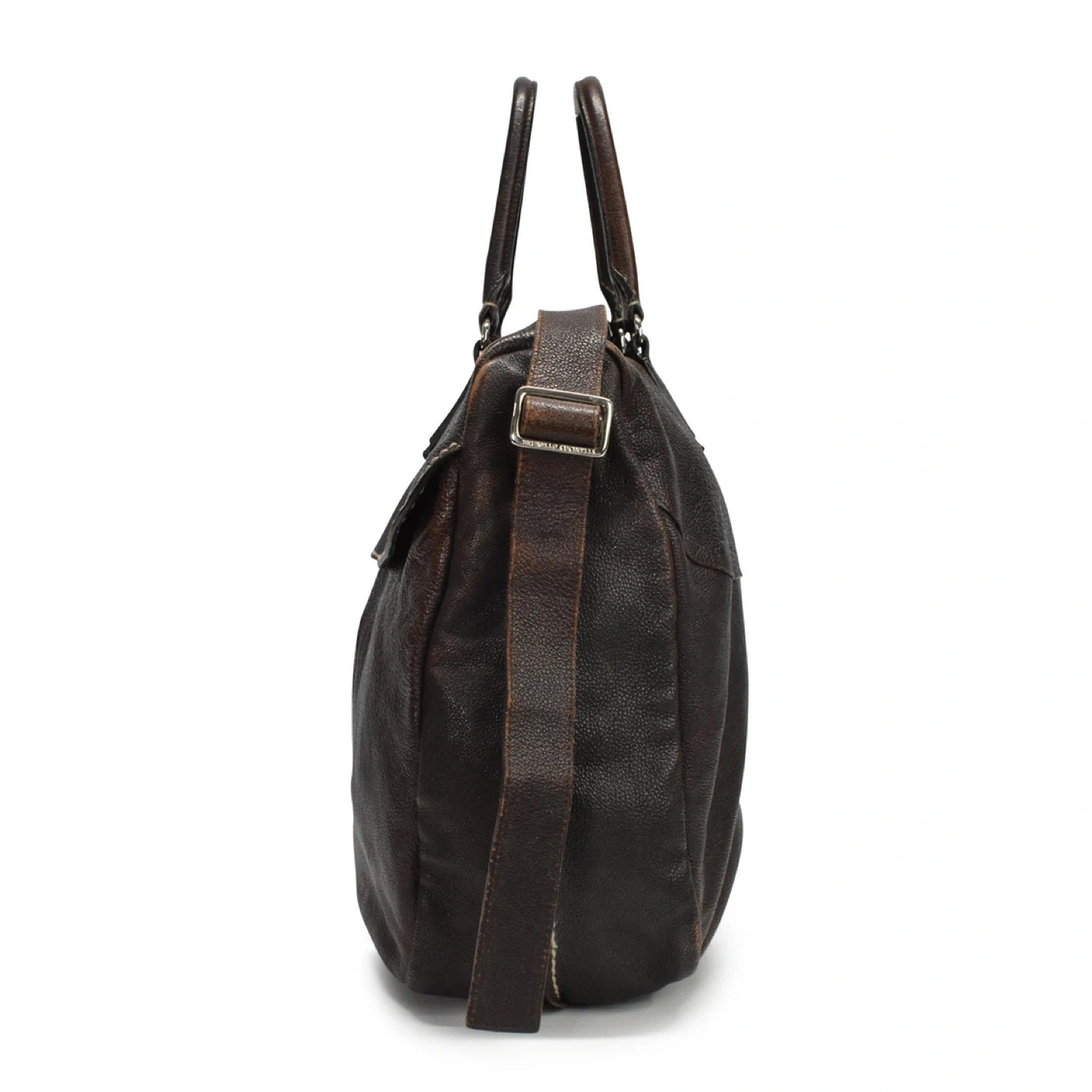 Brunello Cucinelli oversized tote bag in brown grained leather with beige contrast stitching and rolled top handles. Features a front flap with two open pockets, an adjustable shoulder strap, and an inner zip pocket.