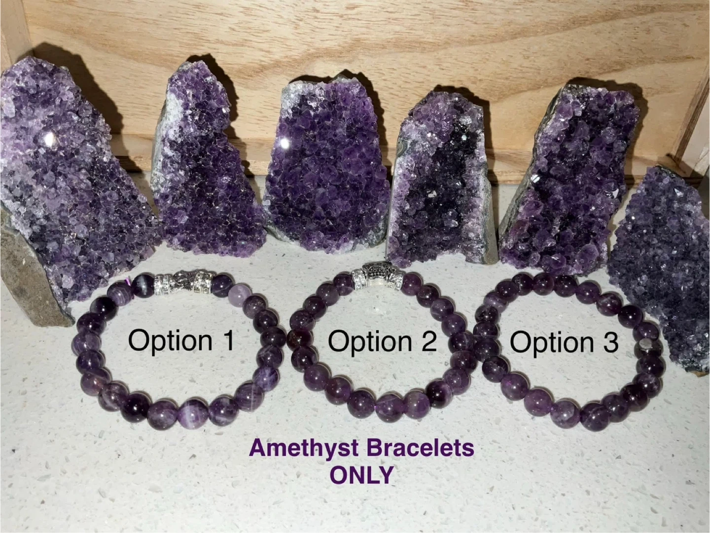 Beautiful real A grade amethyst bracelets, each with unique bead patterns. Choose from Option 1, Option 2, or Option 3. These bracelets are strung with genuine amethyst beads.