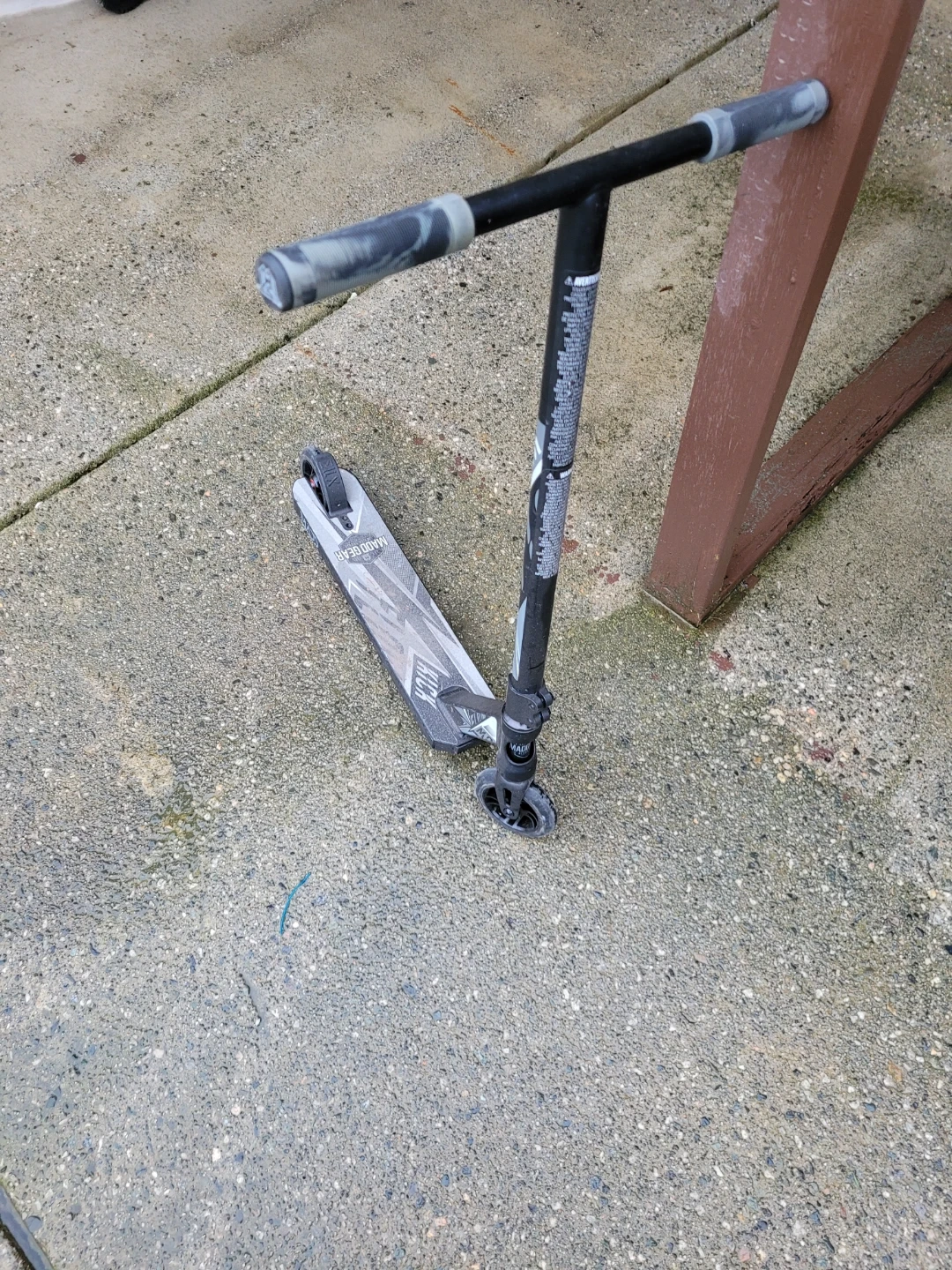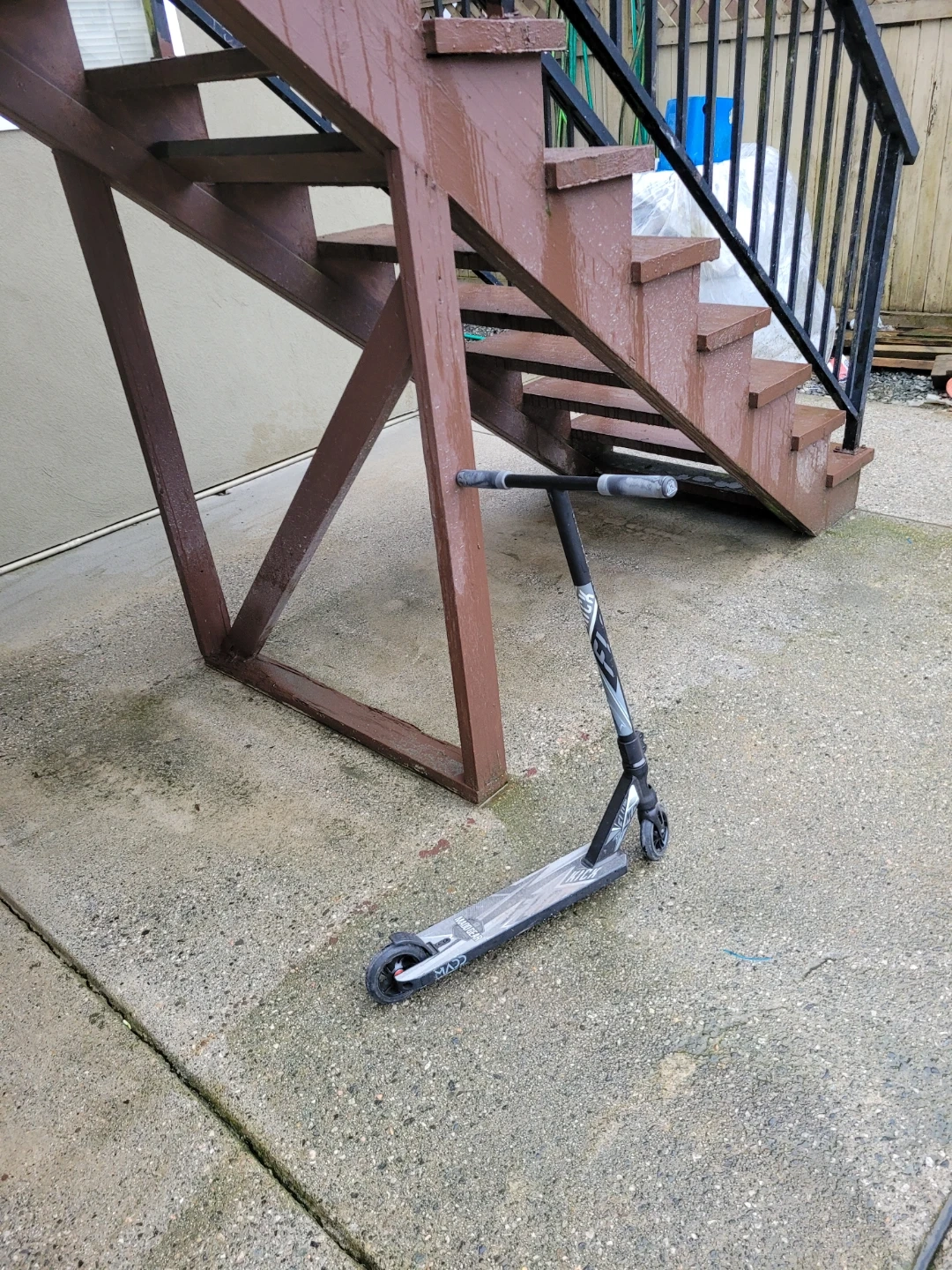 This is an AOVC stunt scooter with a black and grey design. It features a durable deck and handlebar, suitable for tricks. This scooter is ready for some fun at the park!