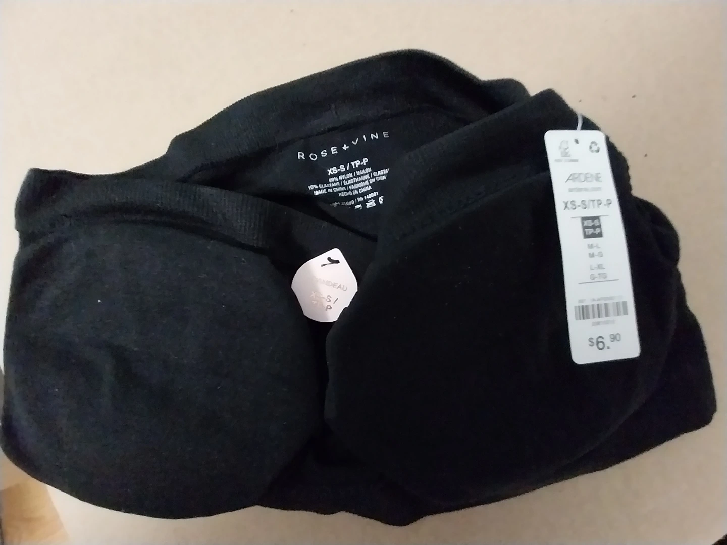 Rose + Vine black bandeau bra in XS-S/TP-P size. It's made of 90% nylon and 10% elastane. New and unused. From Ardene.