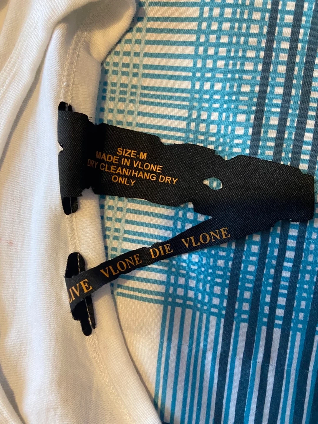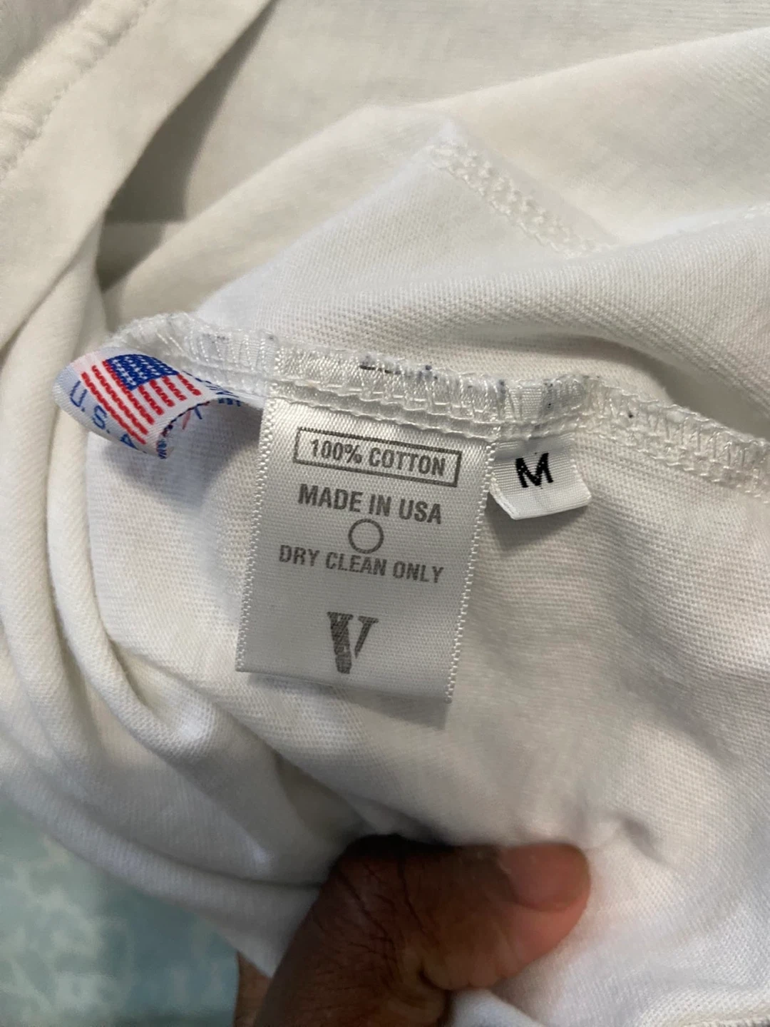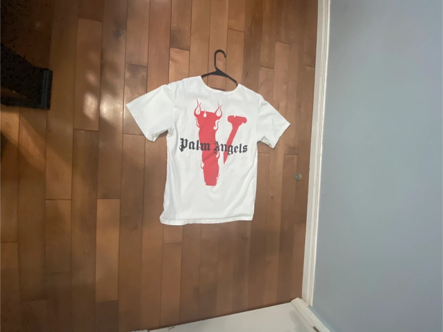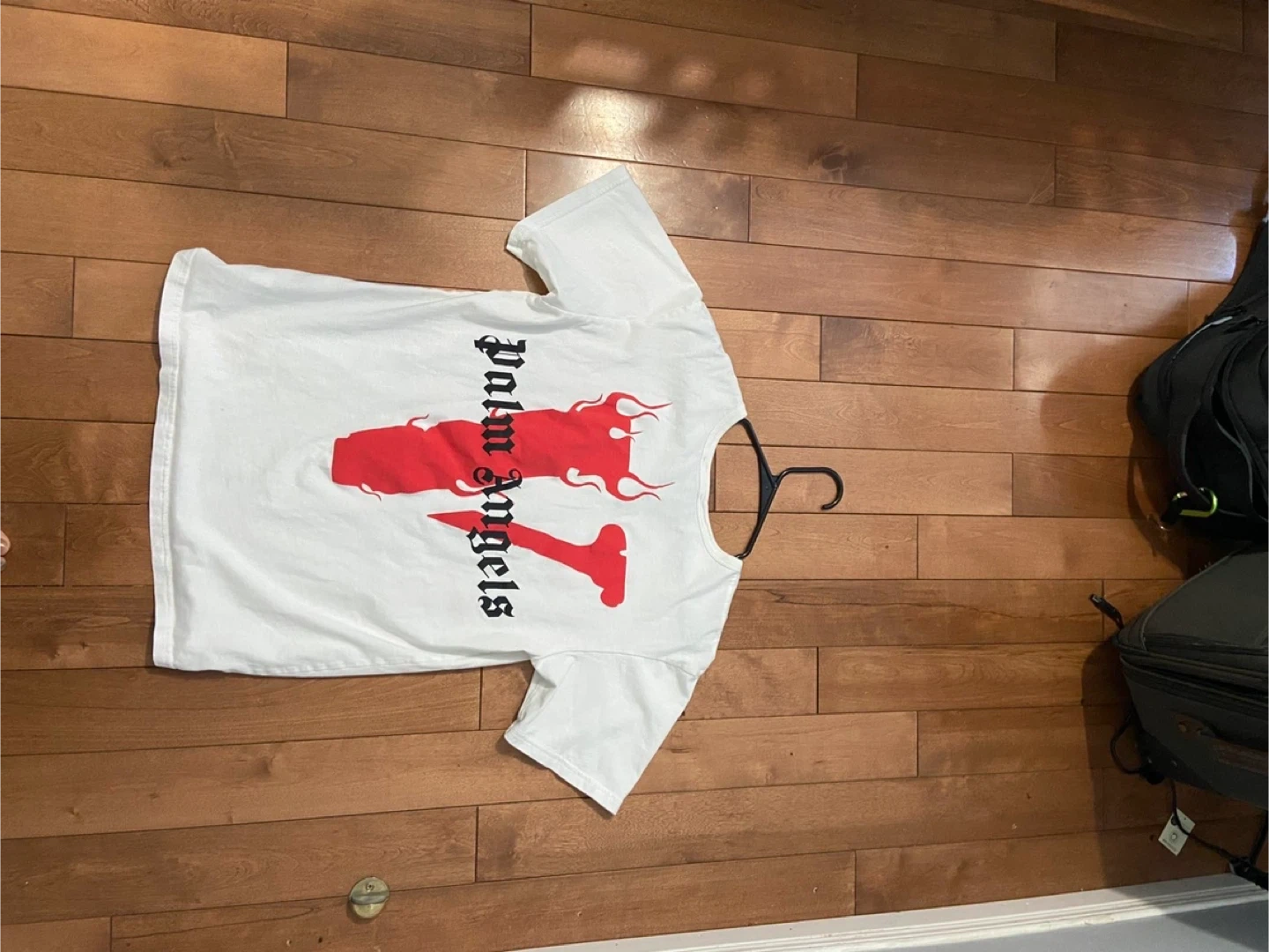 This is a white Vlone t-shirt with a red Palm Angels graphic print. It's made of 100% cotton and manufactured in the USA. The size is medium.