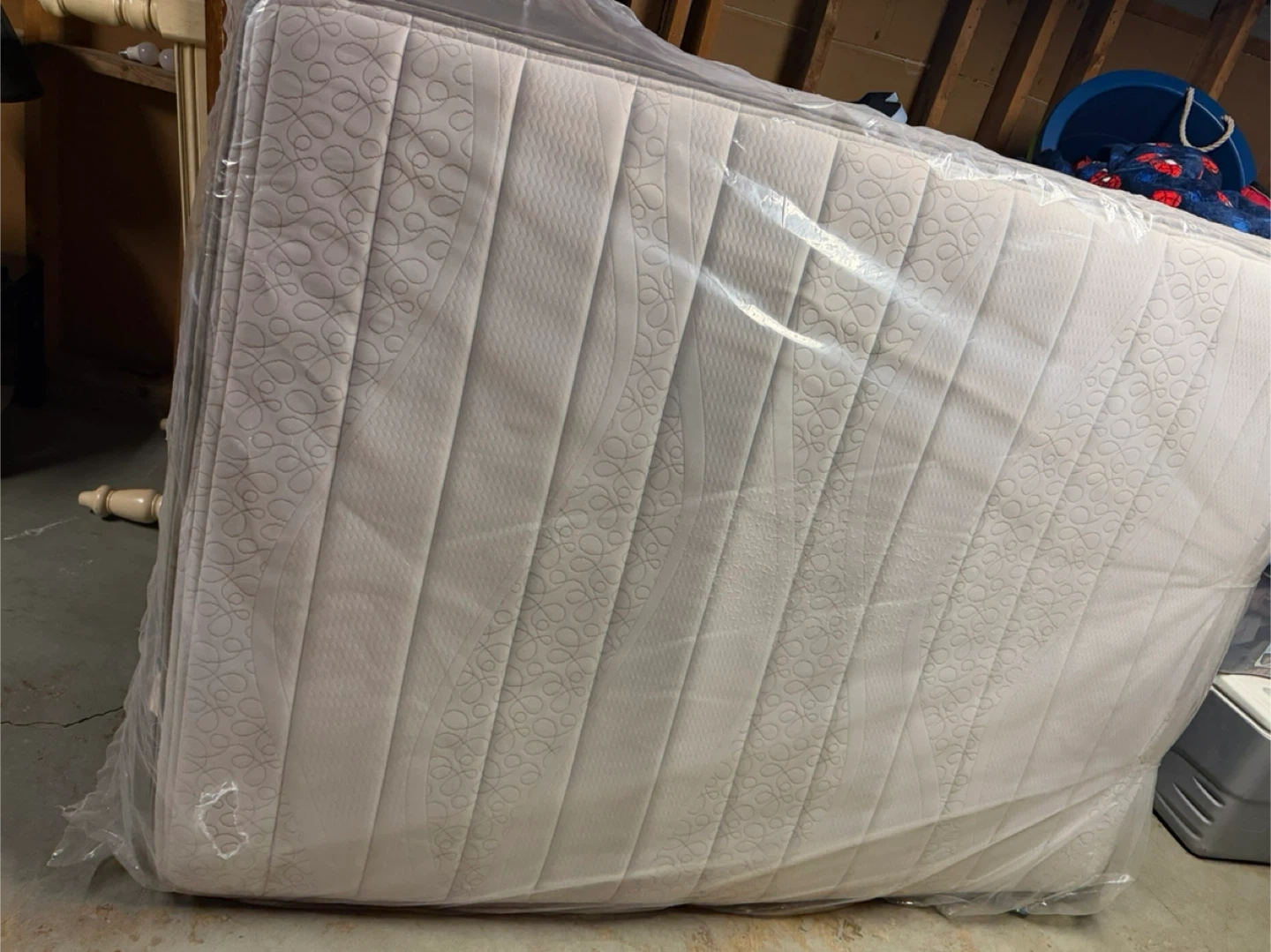 White double size mattress with a patterned quilted design. It's still in its original plastic wrapping. This mattress is a good option for a spare room or guest bed.