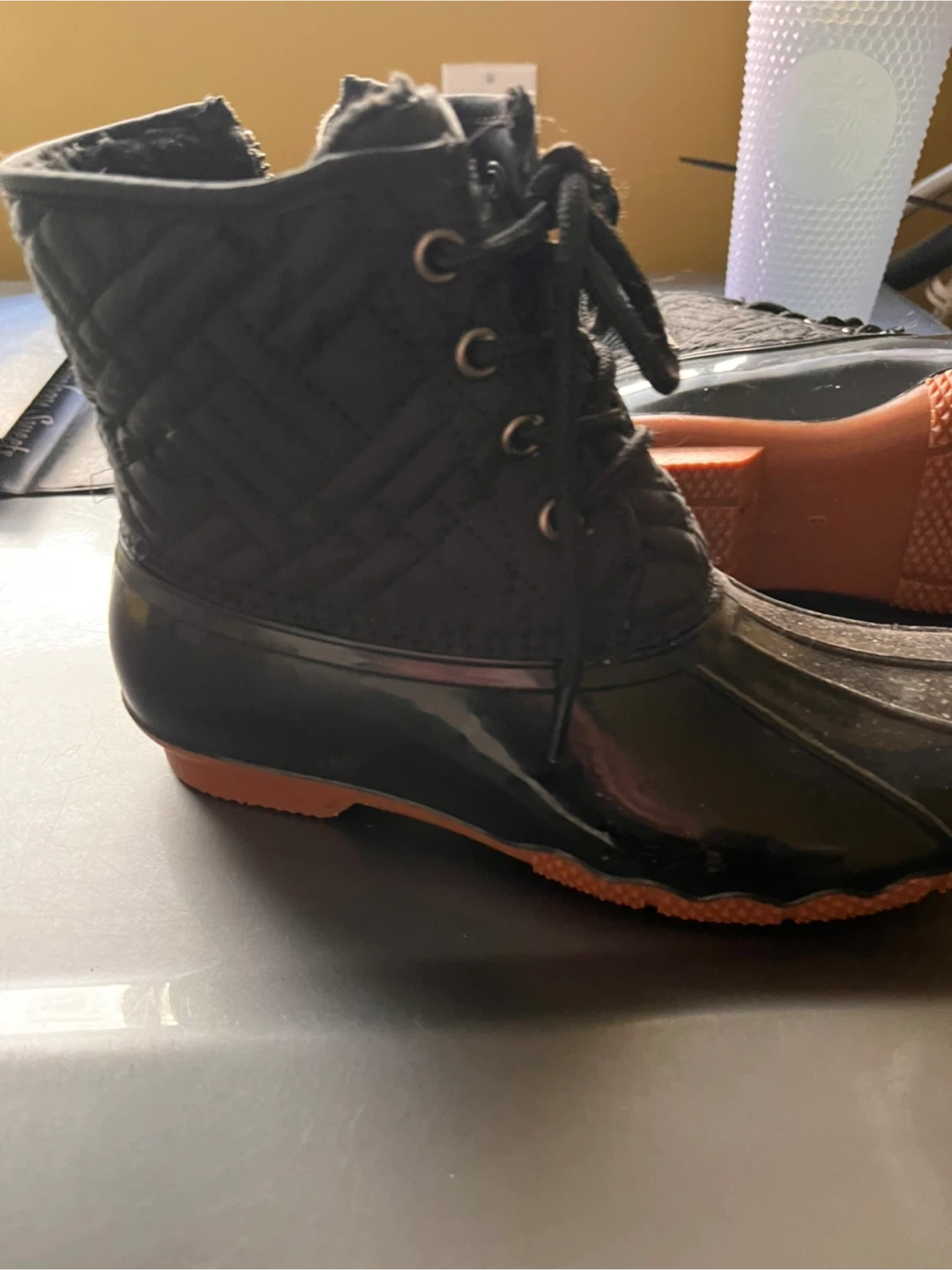 Cute black duck boots! They have a quilted design on the upper part of the boot and a lace-up front. The sole is a contrasting orange colour