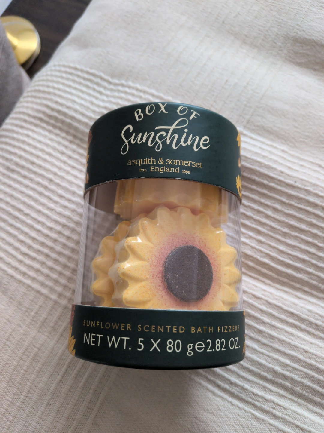 This box contains five sunflower scented bath fizzers. Each fizzer weighs 80g, for a total net weight of 2.82 oz. They're perfect for a relaxing bath! Great gift