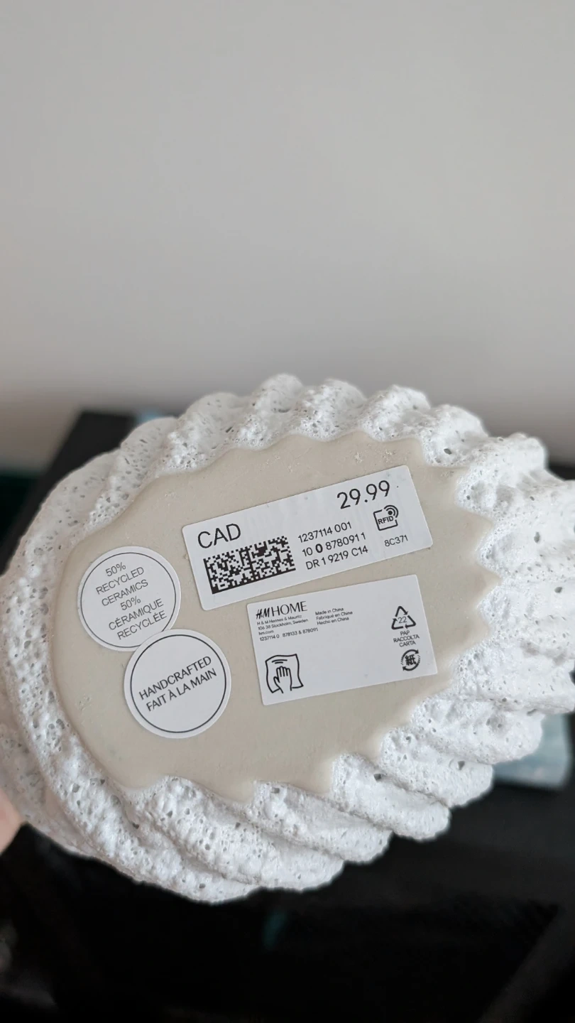 The H&M Home vase is handcrafted from 50% recycled ceramics. It's designed to look like a seashell.