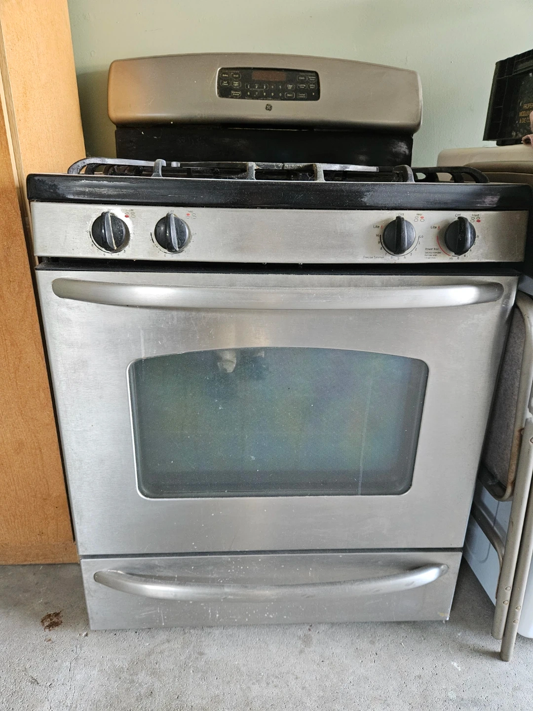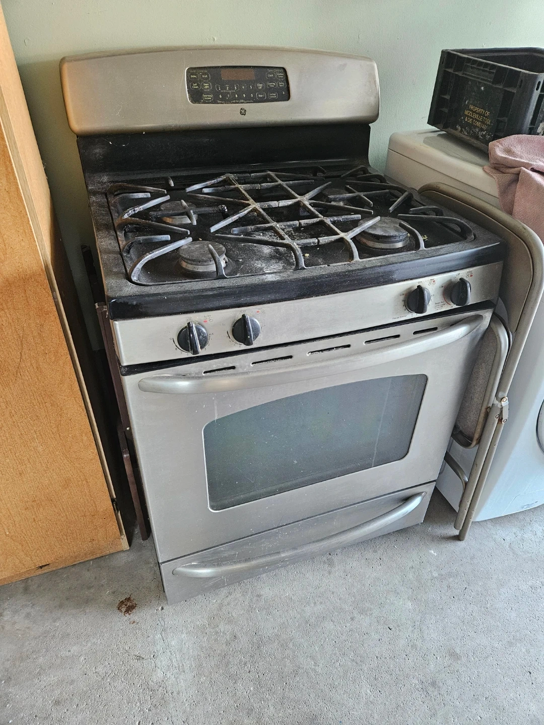 This is a GE stainless steel gas range. It has four burners on top and an oven below. The oven interior includes three racks.