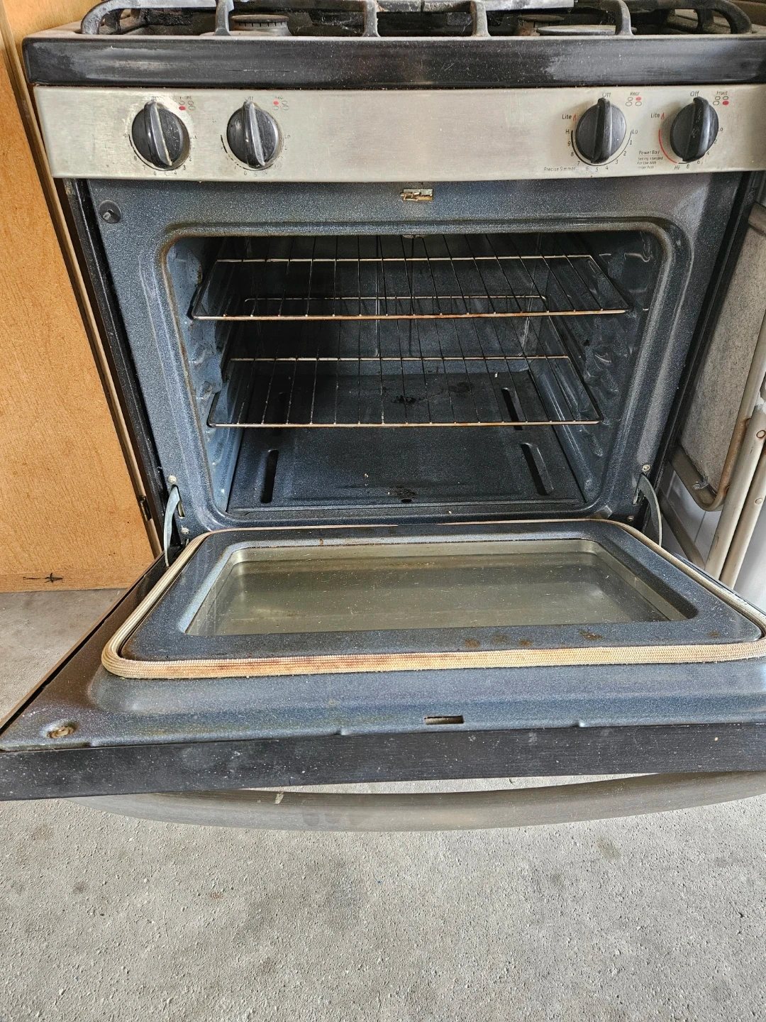 This is a GE stainless steel gas range. It has four burners on top and an oven below. The oven interior includes three racks.