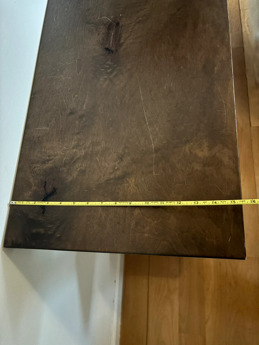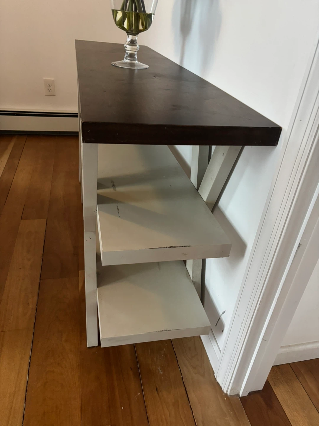 Console table with a dark wood top and white X-frame legs. It has three shelves for storage or display. Tabletop measures 60 inches long. Height is 31 inches, and width is 15.5 inches. Great for entryways or living rooms!