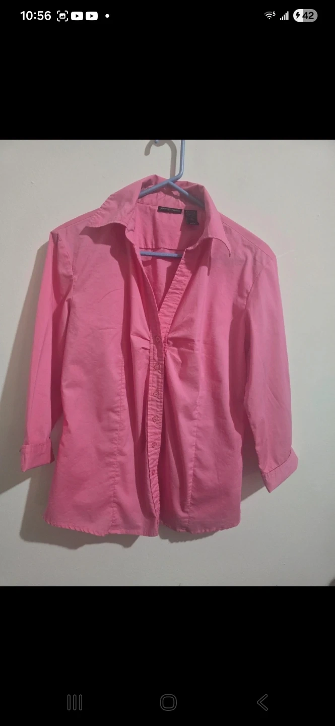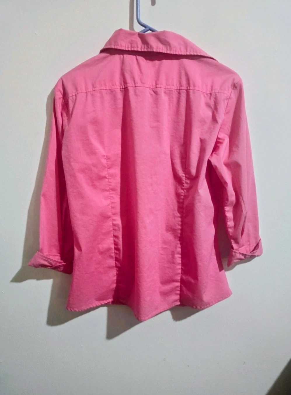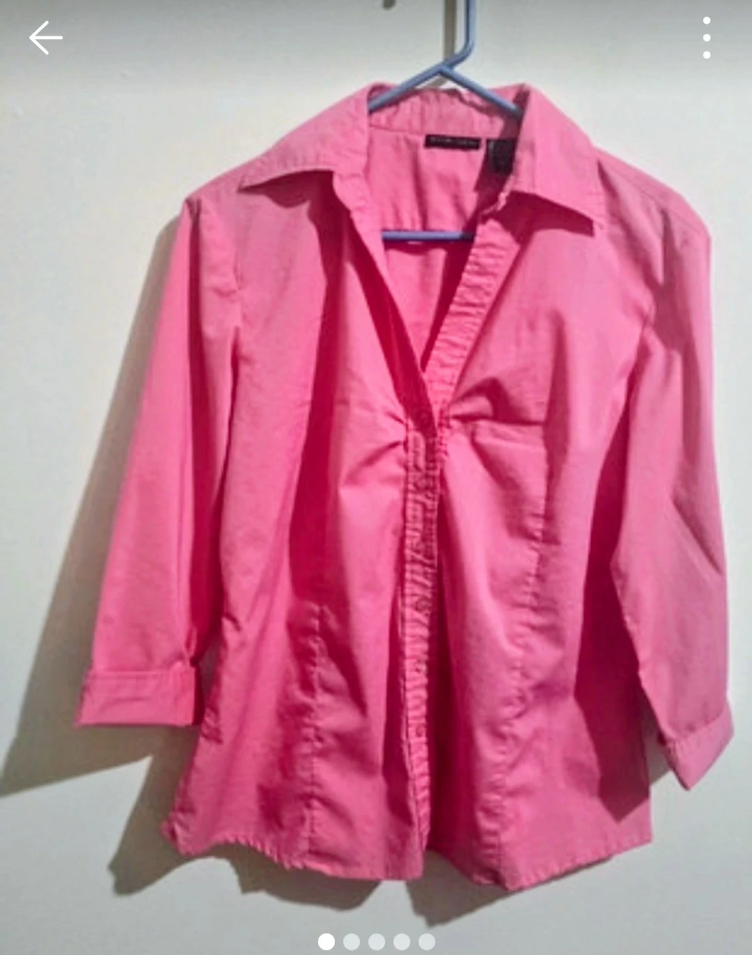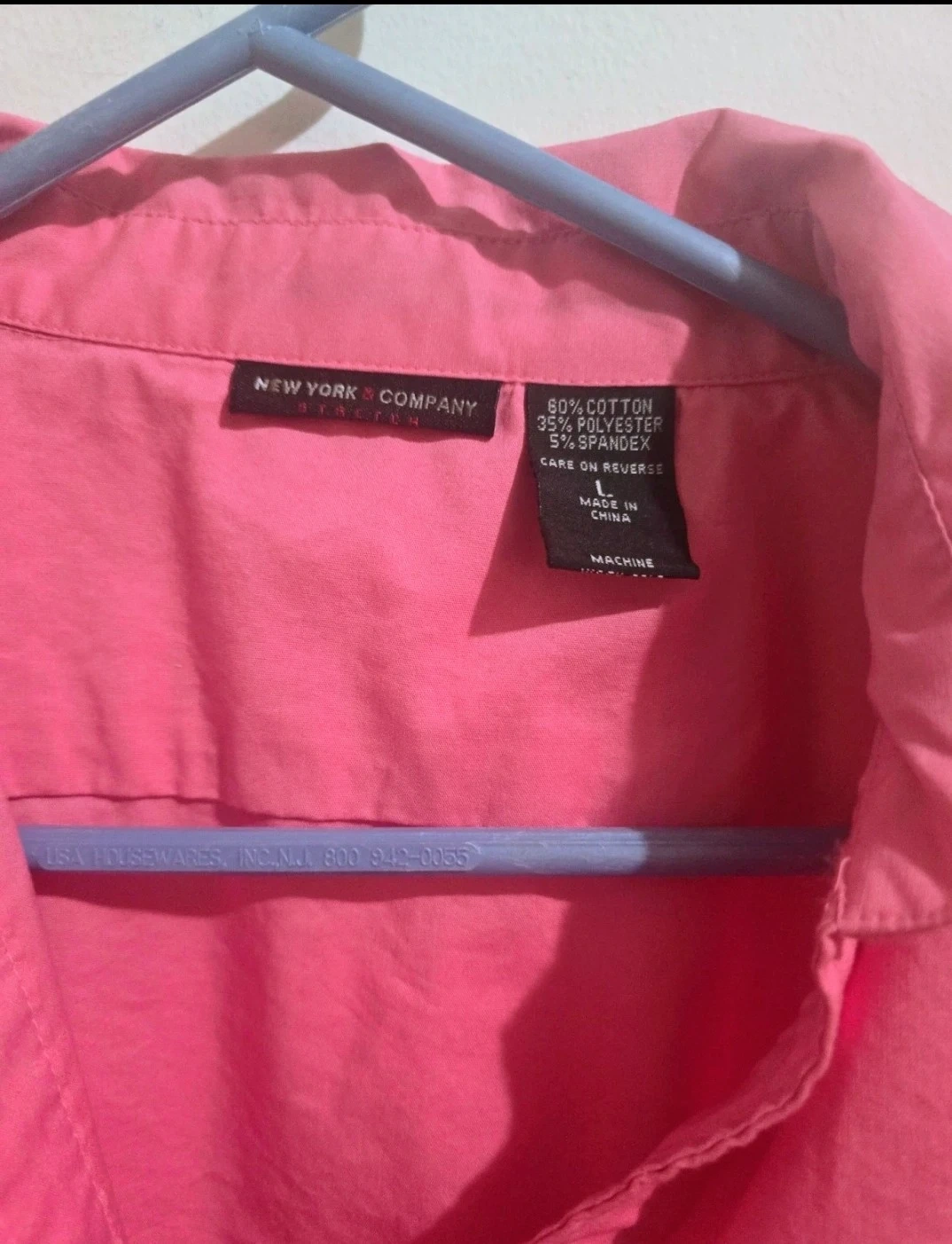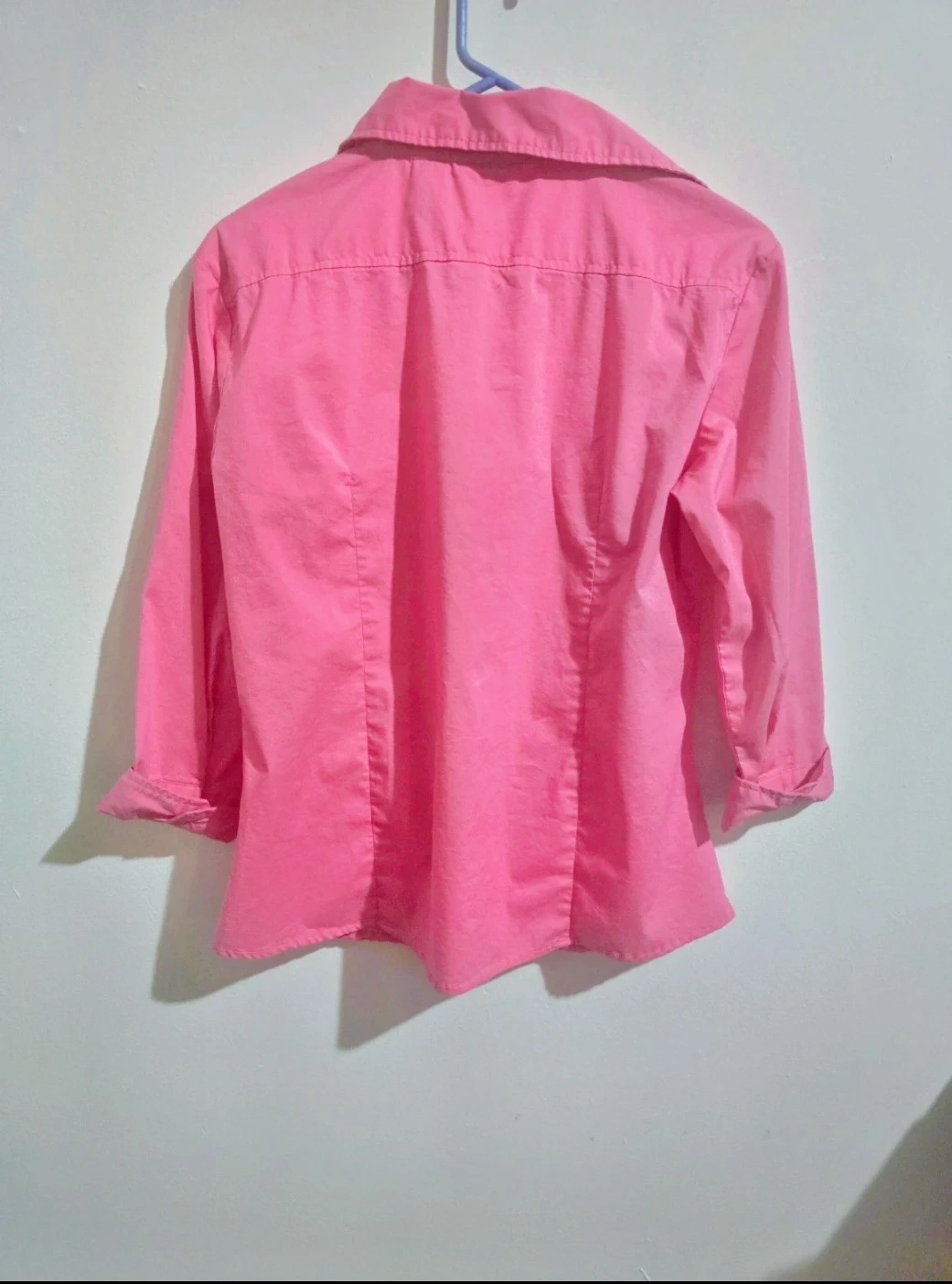 A classic and flattering dress shirt from New York & Company. It's in very good used condition with no flaws. This is a size Large (L) in a lovely light pink color. The fabric is a cotton/spandex blend, making it comfortable and stretchy for a perfect fit. It features 3/4 length sleeves and a tailored cut. Ideal for the office or a smart casual look. NOTE: I also have this exact blouse available in a lime green color. Check out my closet and I can create a bundle for you