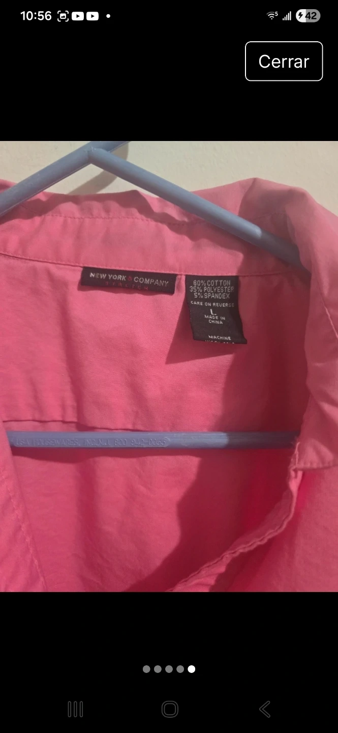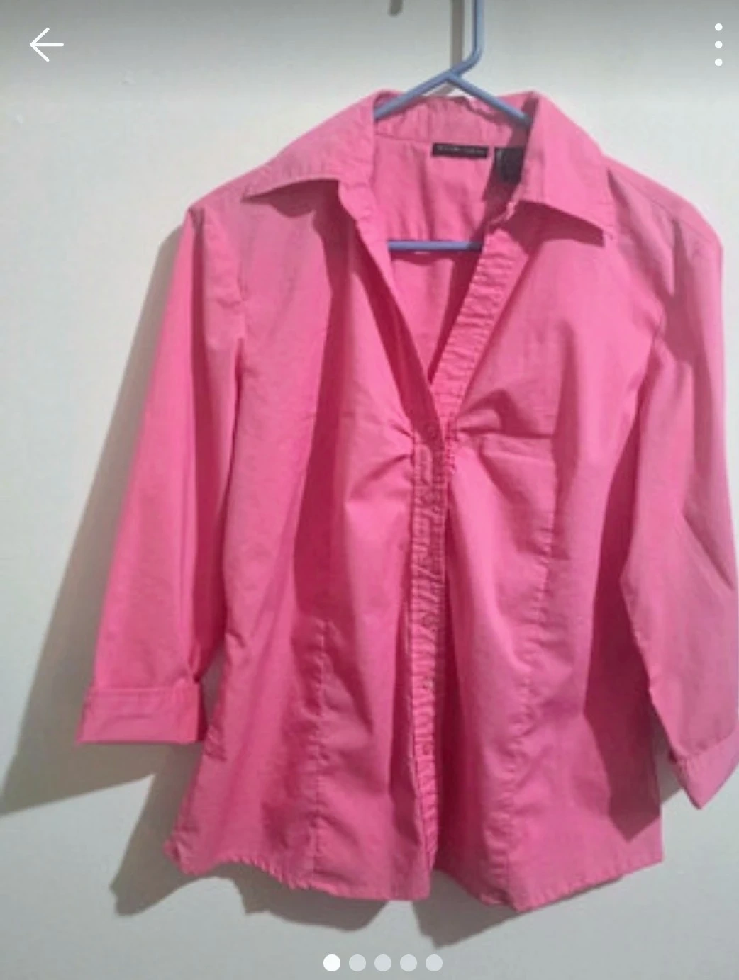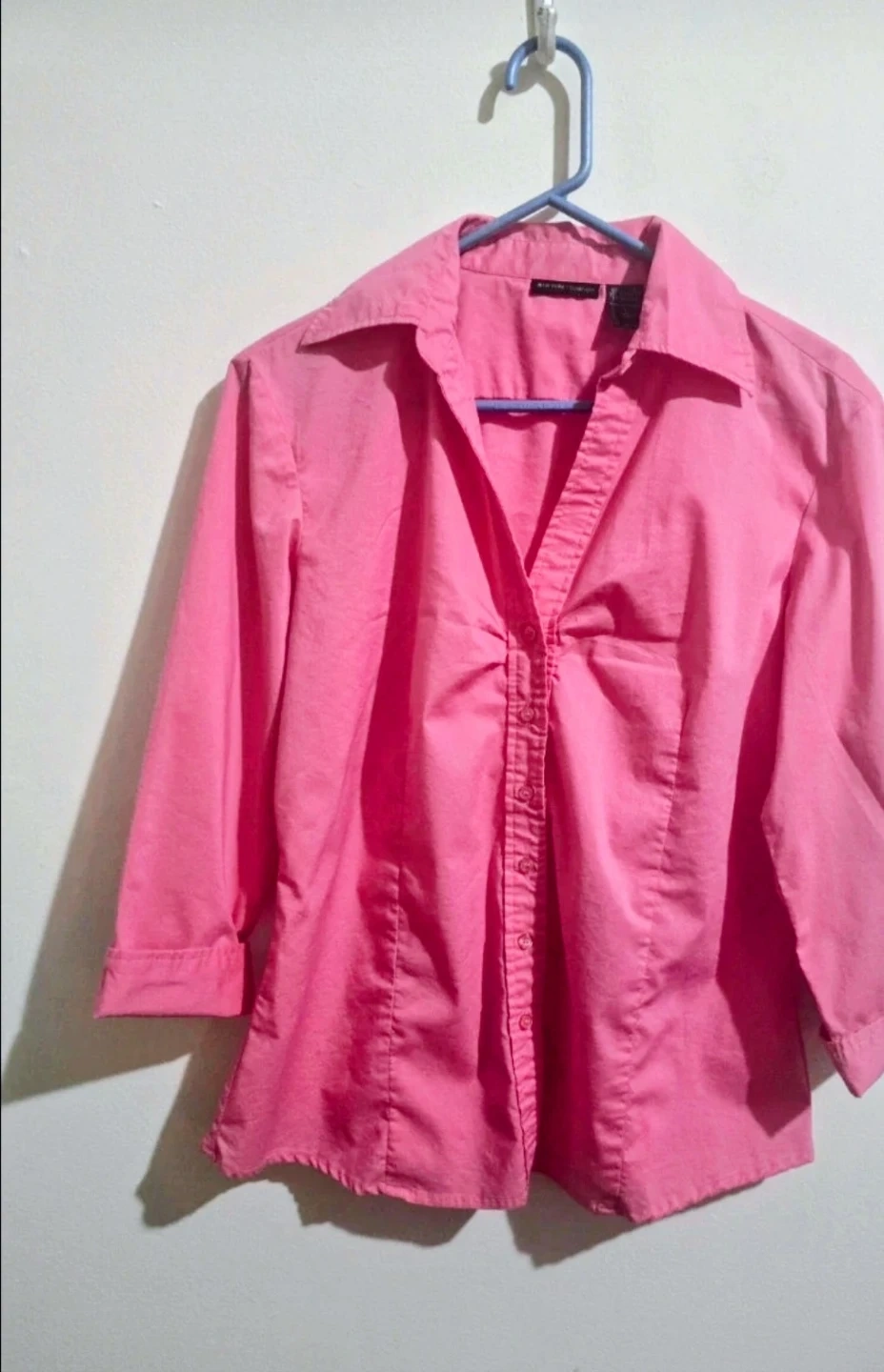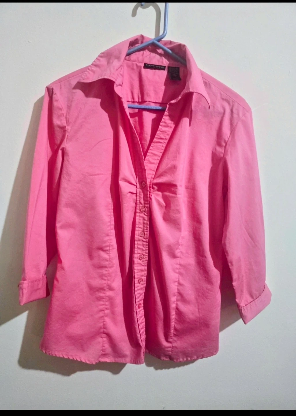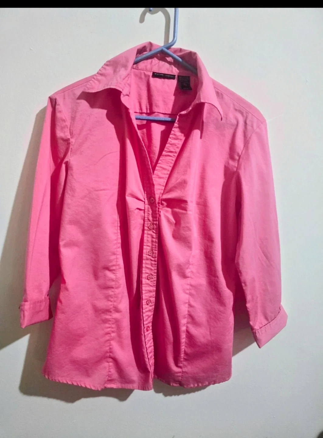A classic and flattering dress shirt from New York & Company. It's in very good used condition with no flaws. This is a size Large (L) in a lovely light pink color. The fabric is a cotton/spandex blend, making it comfortable and stretchy for a perfect fit. It features 3/4 length sleeves and a tailored cut. Ideal for the office or a smart casual look. NOTE: I also have this exact blouse available in a lime green color. Check out my closet and I can create a bundle for you