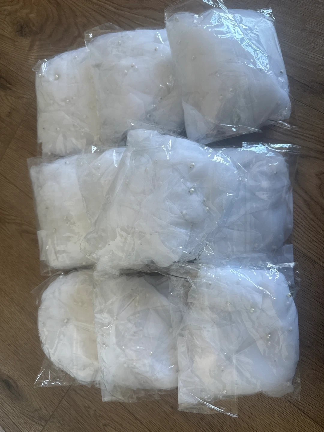 10 white tulle table runner, embellished with faux pearls. It measures 160cm (63 inches) long and 100cm (39 inches) wide. This runner adds a decorative touch to a table.