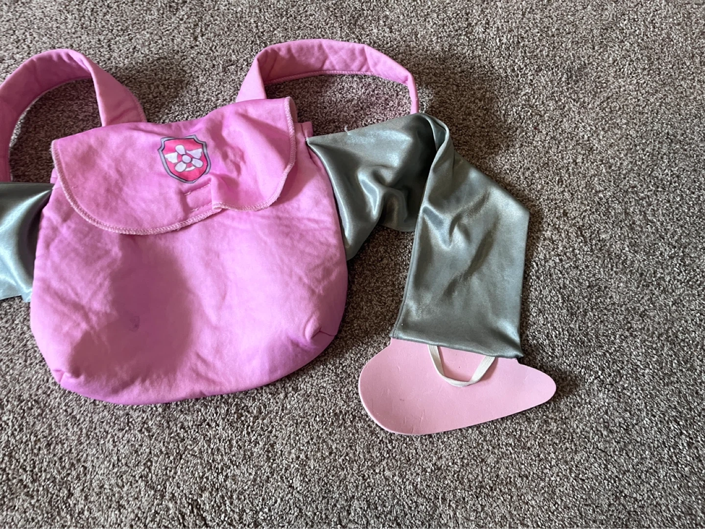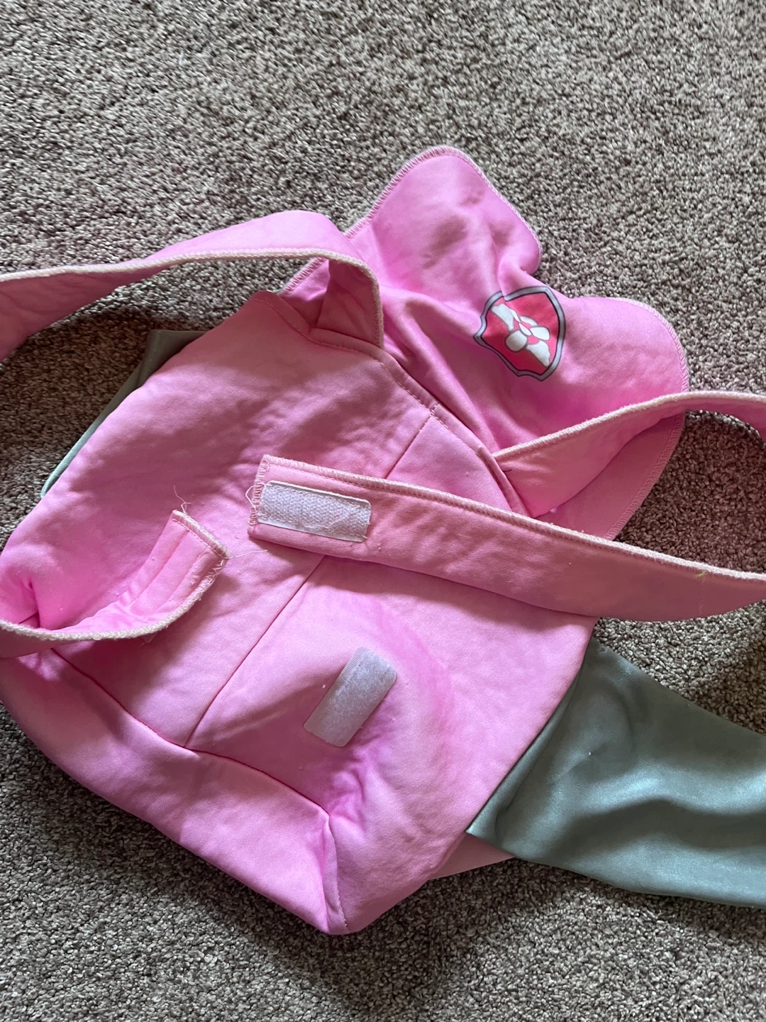 This Paw Patrol Skye costume accessory set includes a pink backpack with a Skye badge and attached grey wings with pink feet. It's designed for kids' dress-up play.