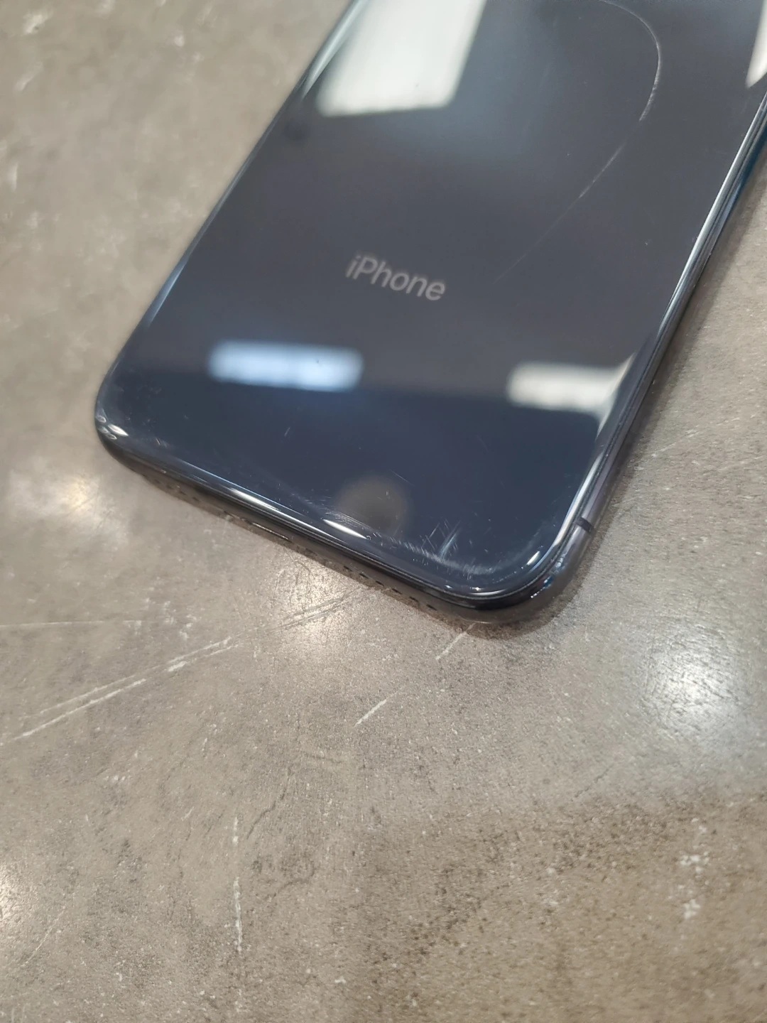 This is an Apple iPhone x. It's a used smartphone. It's a dark colour, likely black or dark grey. It shows some signs of wear like minor scratches on the back. It has the iconic iPhone logo on the rear. This phone would be useful for anyone needing a reliable mobile device.