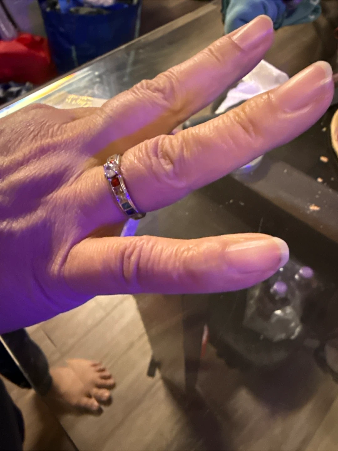 This is a band ring featuring multiple small, colourful stones. It's a lovely accessory that adds a pop of colour. This ring would be suitable for everyday wear or to complement a special outfit!