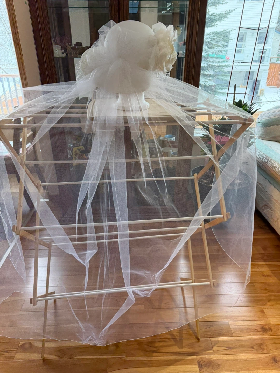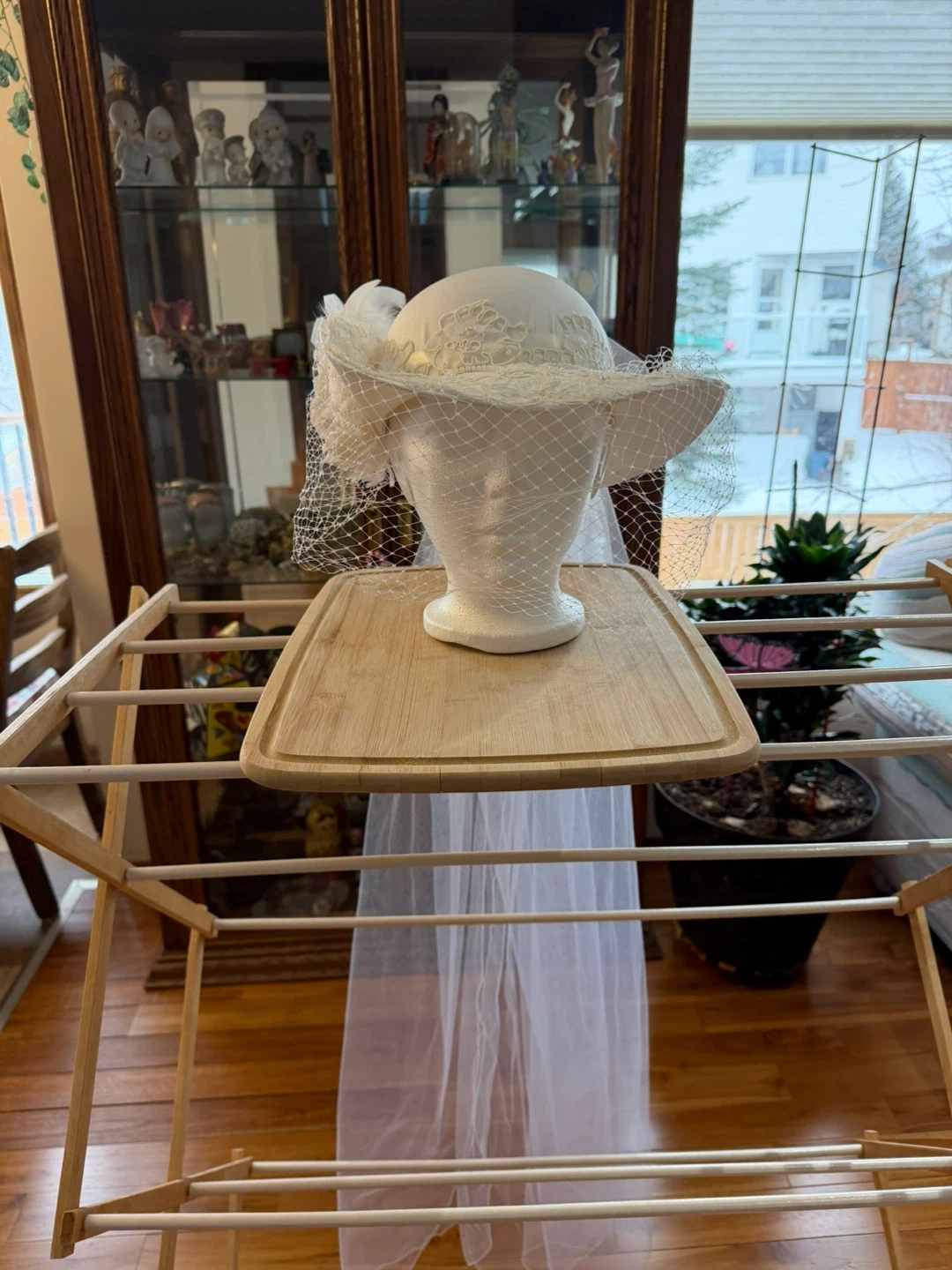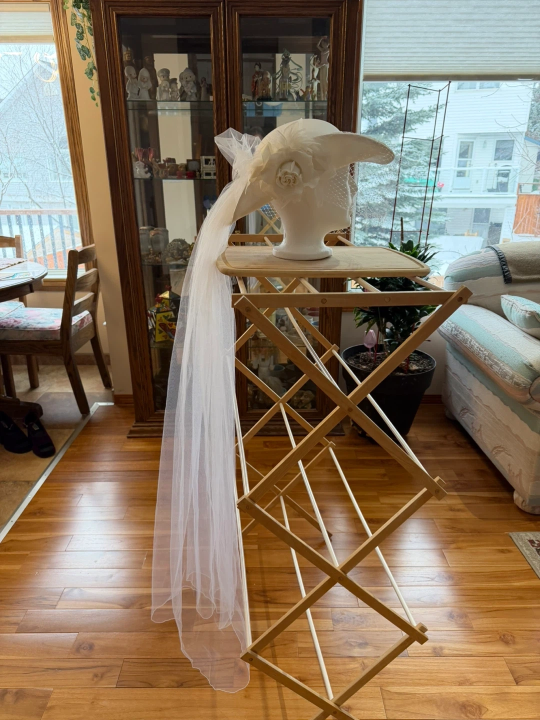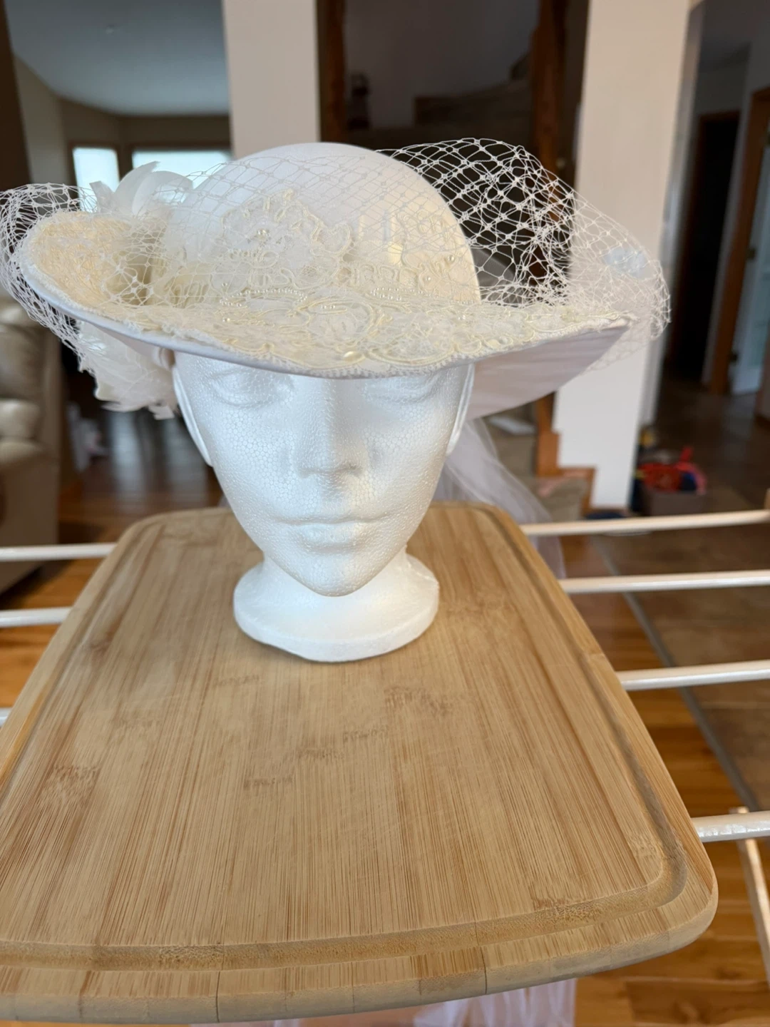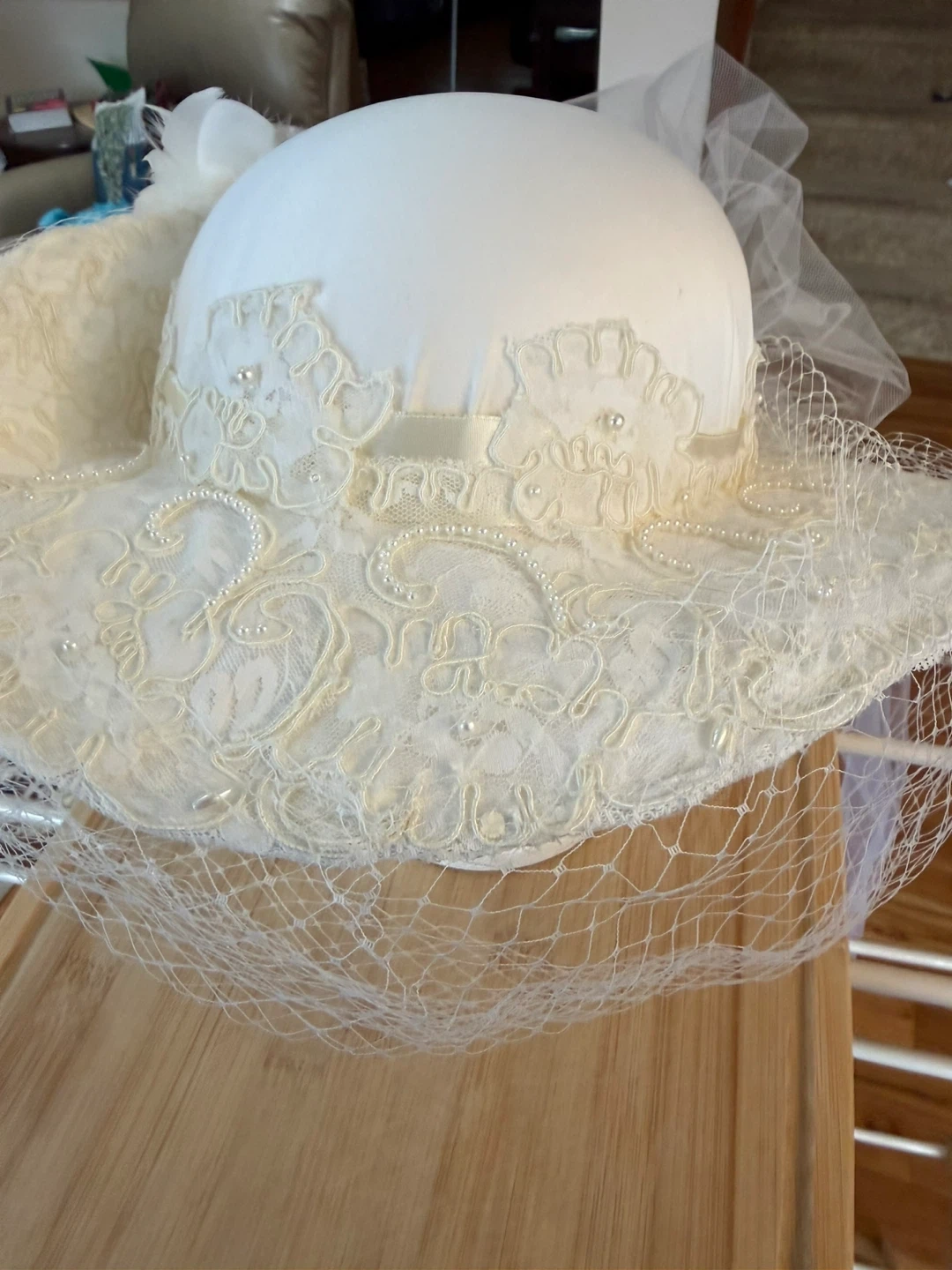 This elegant vintage bridal hat features intricate lace & beading detailing and a delicate 46 inch veil, perfect for adding a touch of classic sophistication to any special occasion. The hat is in great condition, showing only minor signs of wear consistent with its age, making it a unique and charming accessory.