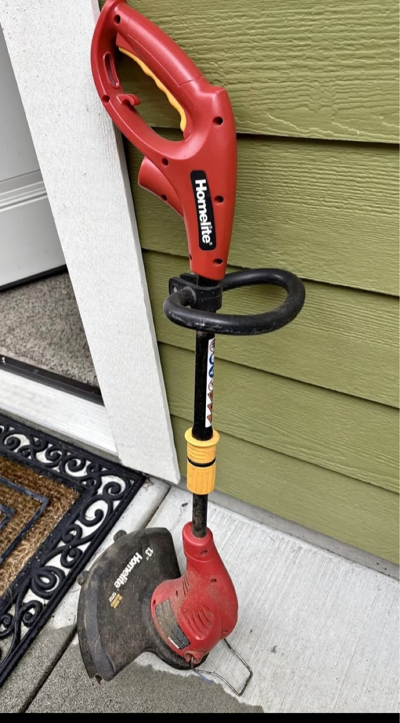 Homelite electric string trimmer with a 13-inch cutting path. It's red and black with a yellow accent. This trimmer is great for tidying up your yard!