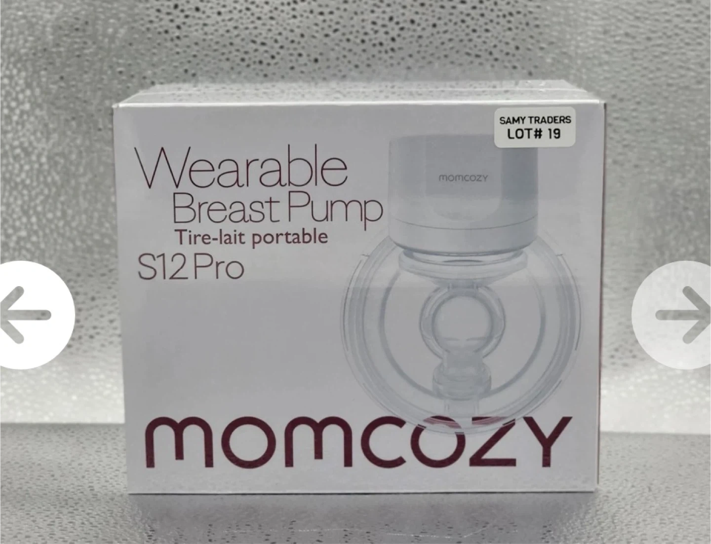 This is a Momcozy S12 Pro wearable breast pump. It's designed to be portable and hands-free for easy use. The pump is a closed system.