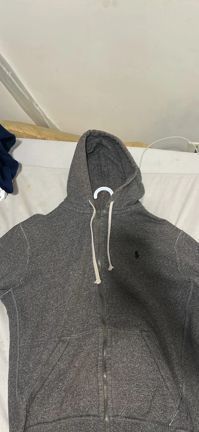 Selling a Ralph Lauren full-zip hoodie in grey! It has a small logo on the chest. Perfect for layering or wearing on its own.