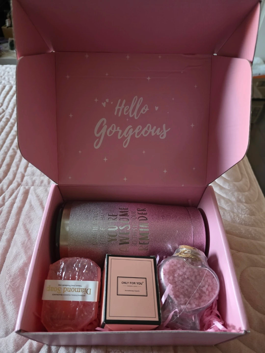 This gift box is perfect for a 'hello gorgeous' surprise! It contains a "You're Awesome" tumbler, pink bath salts in a heart-shaped bottle, a "Diamond Soap" bar, and a small "Only For You" perfume. It's a lovely curated gift set for someone special.