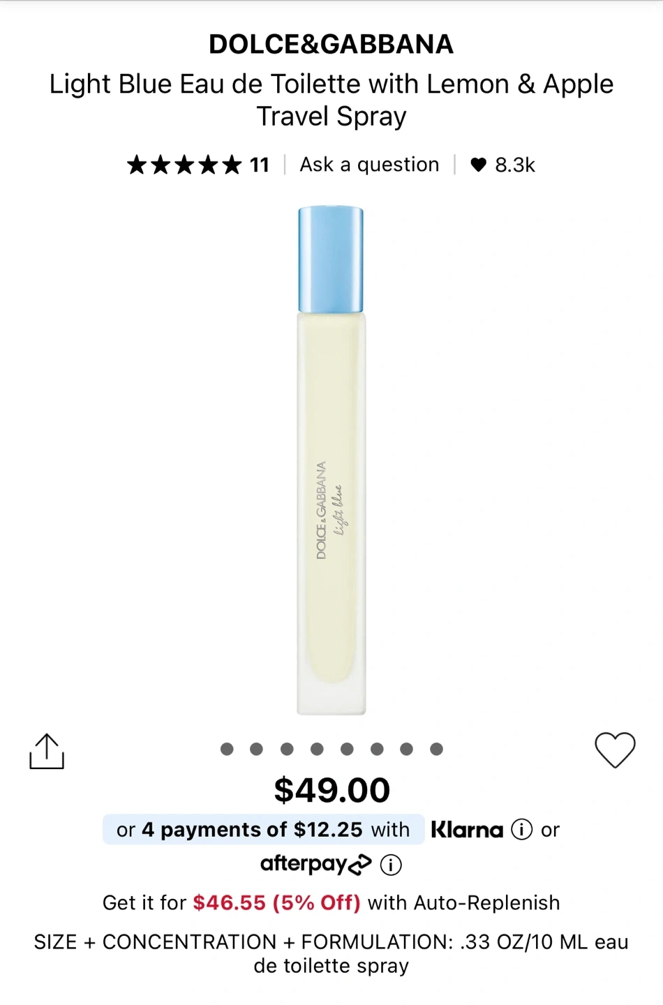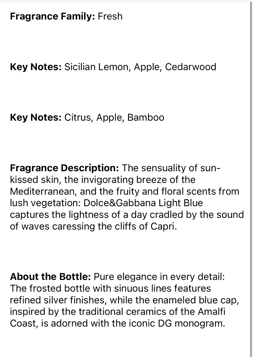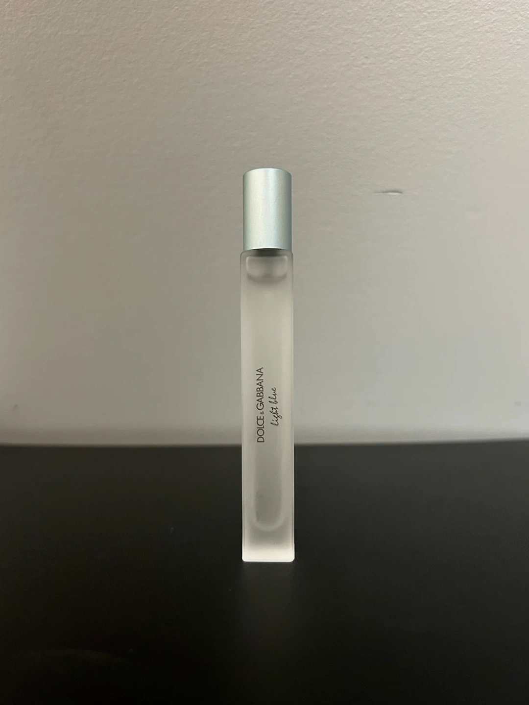 Dolce&Gabbana Light Blue Eau de Toilette travel spray perfume. A fresh fragrance with key notes of Sicilian lemon, apple, and cedarwood. Captures the sensuality of sun-kissed skin and the fruity and floral scents from lush vegetation, inspired by the Amalfi Coast. .33 oz/ 10ml. Brand new - unused.