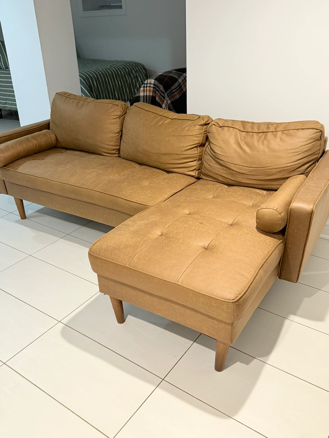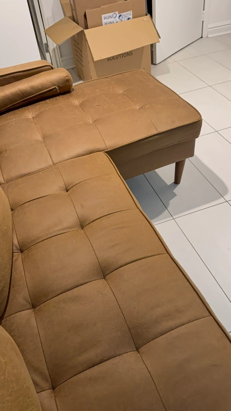 Moving sale. Must go this weekend: sectional sofa. Features tufted cushions and mid-century modern style legs. Includes chaise lounge. Very light and good for a small space or a condo. Comes apart for easy shipping